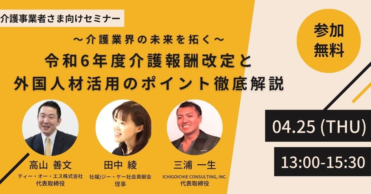 介護ビジネス業界を網羅的に解説する教科書介護ビジネス業界のしくみと仕事がこれ1冊でしっかりわかる教科書の著者であり、ティー・オー・エス株式会社 代表取締役の高山善文氏にご登壇いただき、処遇改善を中心に今回の改定の重要ポイントをたっぷりと解説いただきます。