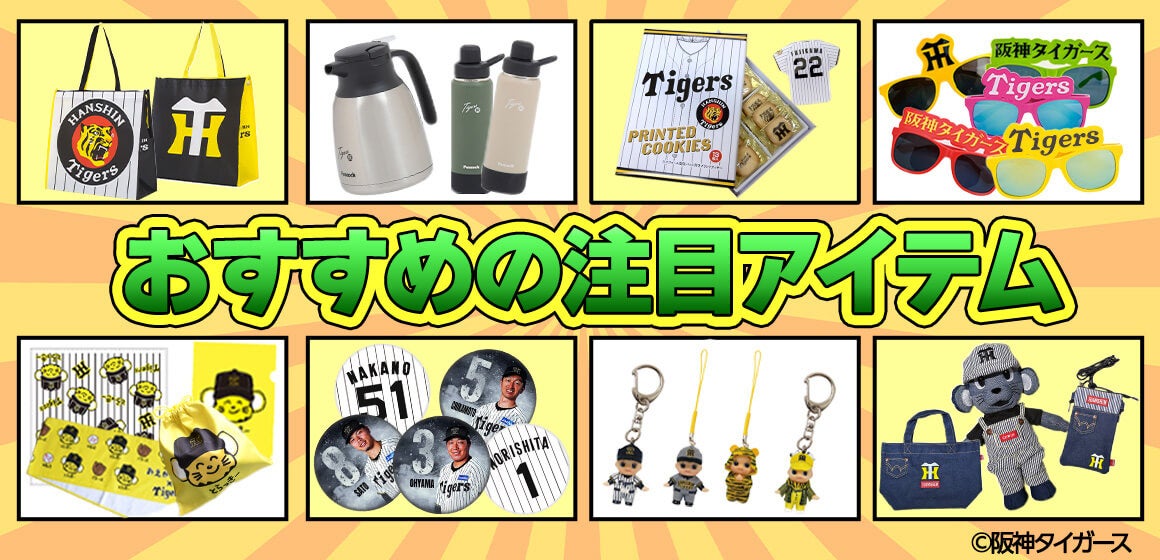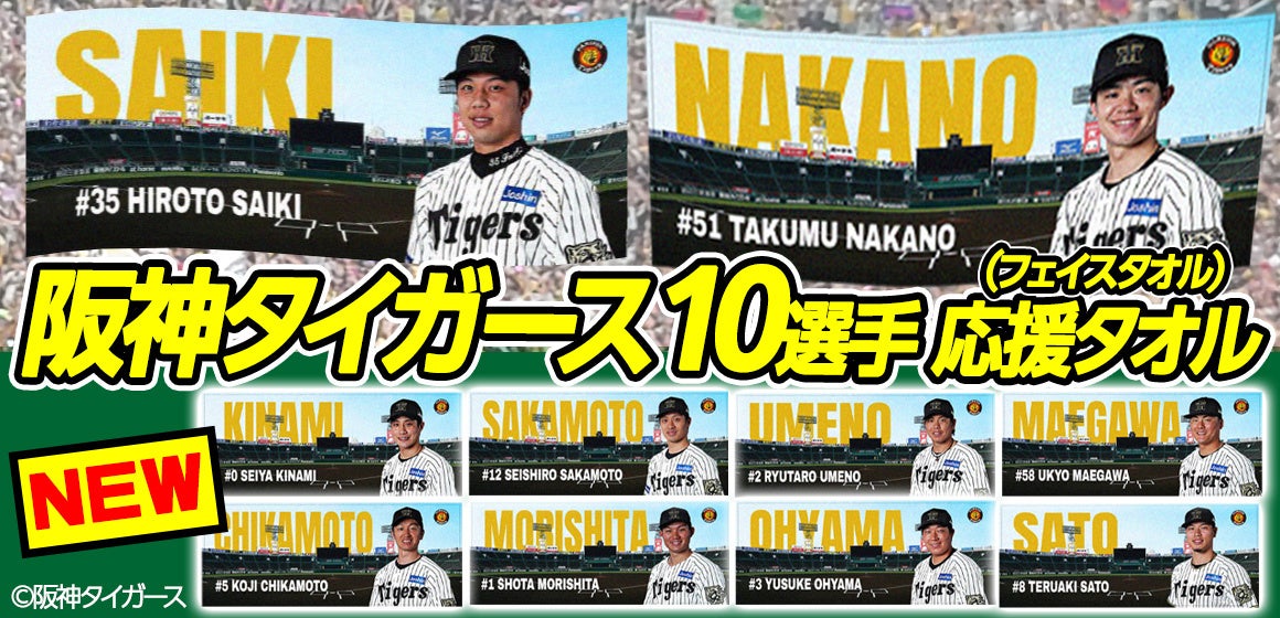 佐藤輝明選手100本塁打、近本光司選手1000本安打記念グッズもTシャツ、缶バッジ、マグカップ、ゴルフマーカーなど多数品揃え。主力10選手の写真入りタオルや、観戦に最適な阪神グッズも多数入荷!