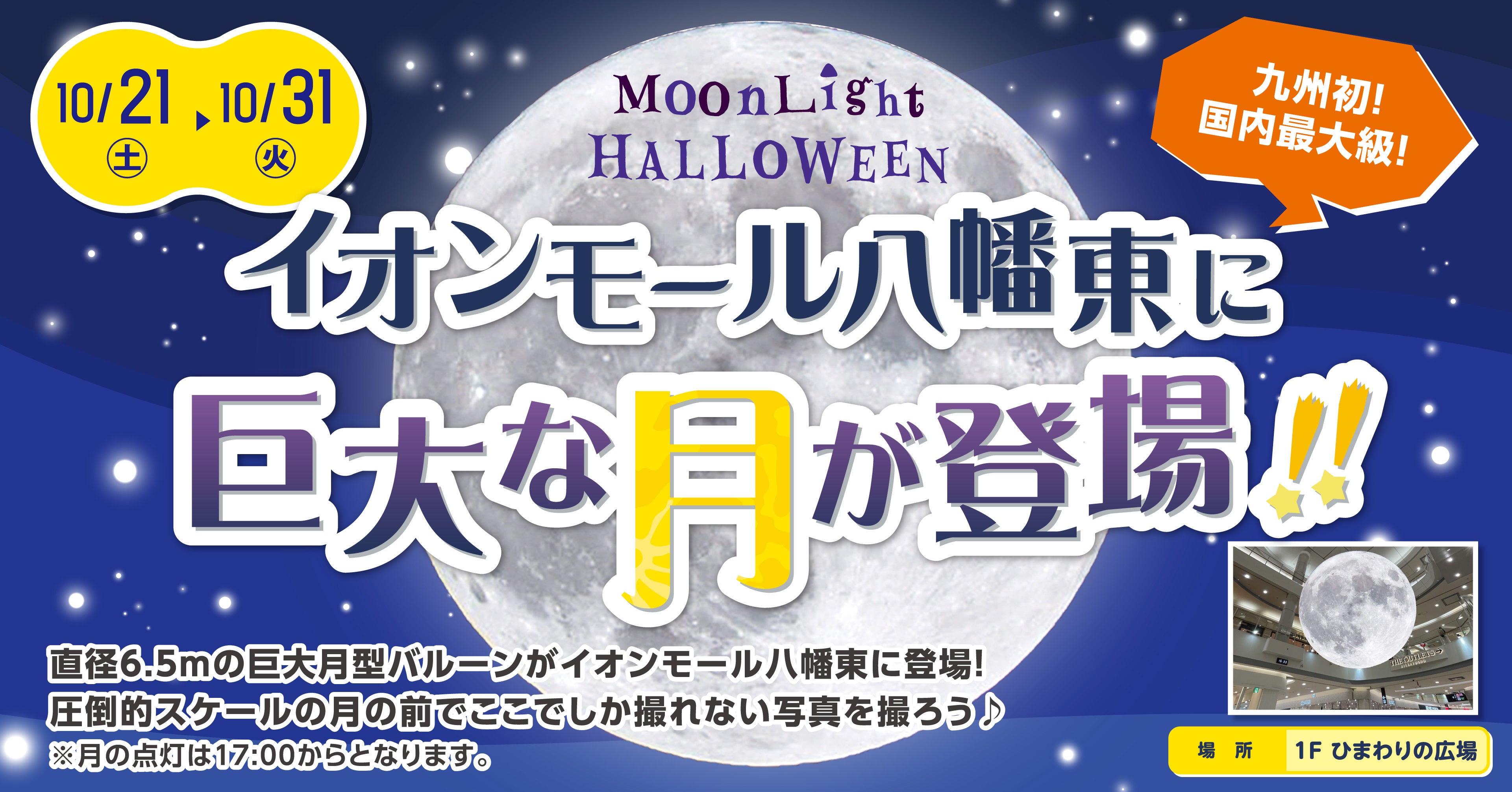 月型のオブジェとしては日本最大級となる直径6.5mの月型フォトジェニックバルーンの設置は今回開催されるイオンモール八幡東のハロウィンイベント「Moon Light HALLOWEEN」において九州では初めてお披露目されます。