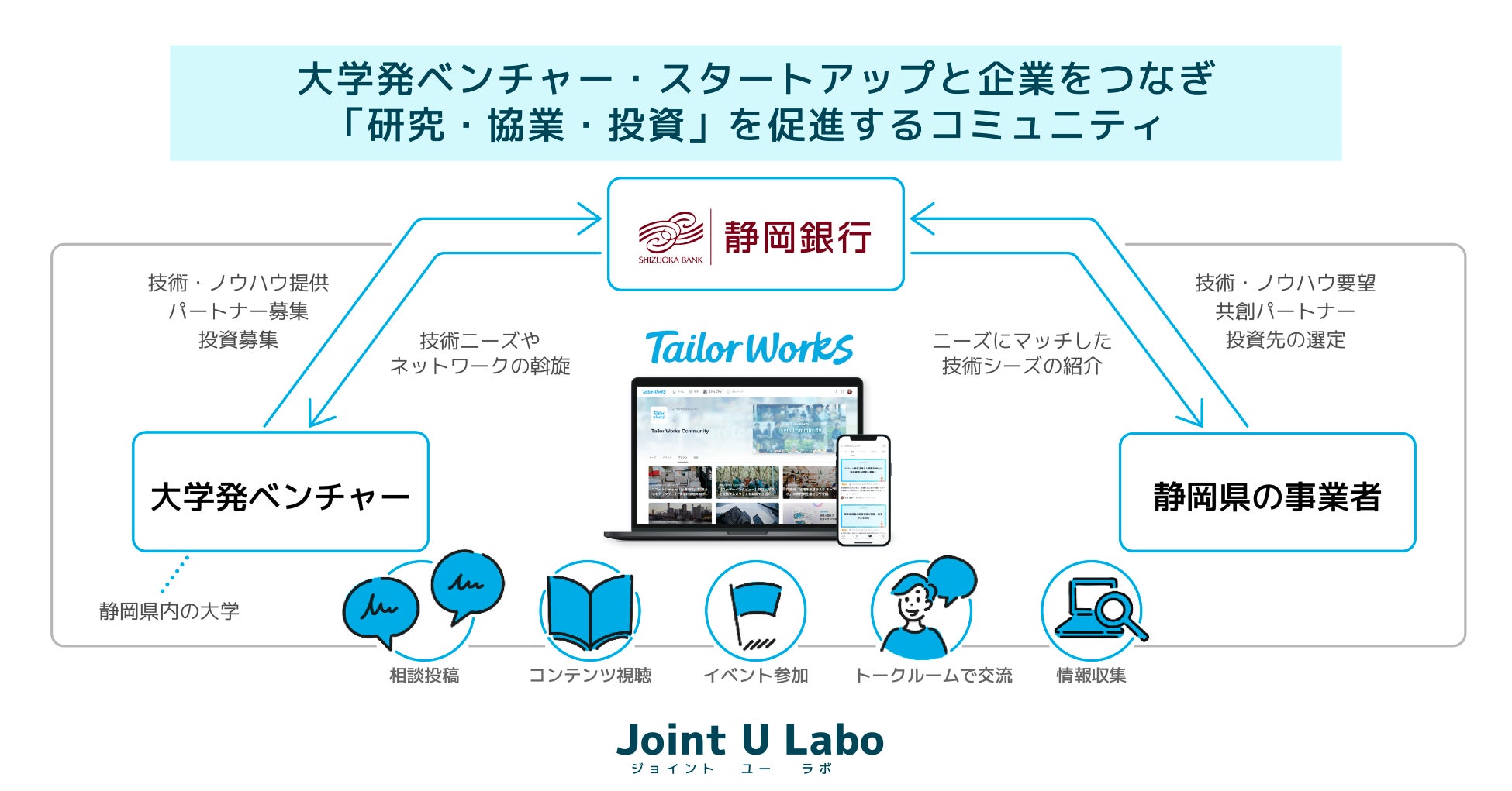 株式会社テイラーワークス(所在地:東京都渋谷区:代表取締役会長 山本 浩之/代表取 締役社長 難波 弘匡、以下、テイラーワークス)は、静岡銀行が、コミュニティアプリ 「Tailor Works(テイラーワークス)」上に大学発ベンチャーの発展を支援するオンラインコミュニティ「Joint U Labo(ジョイント ユー ラボ)」を開設したことをお知らせします。