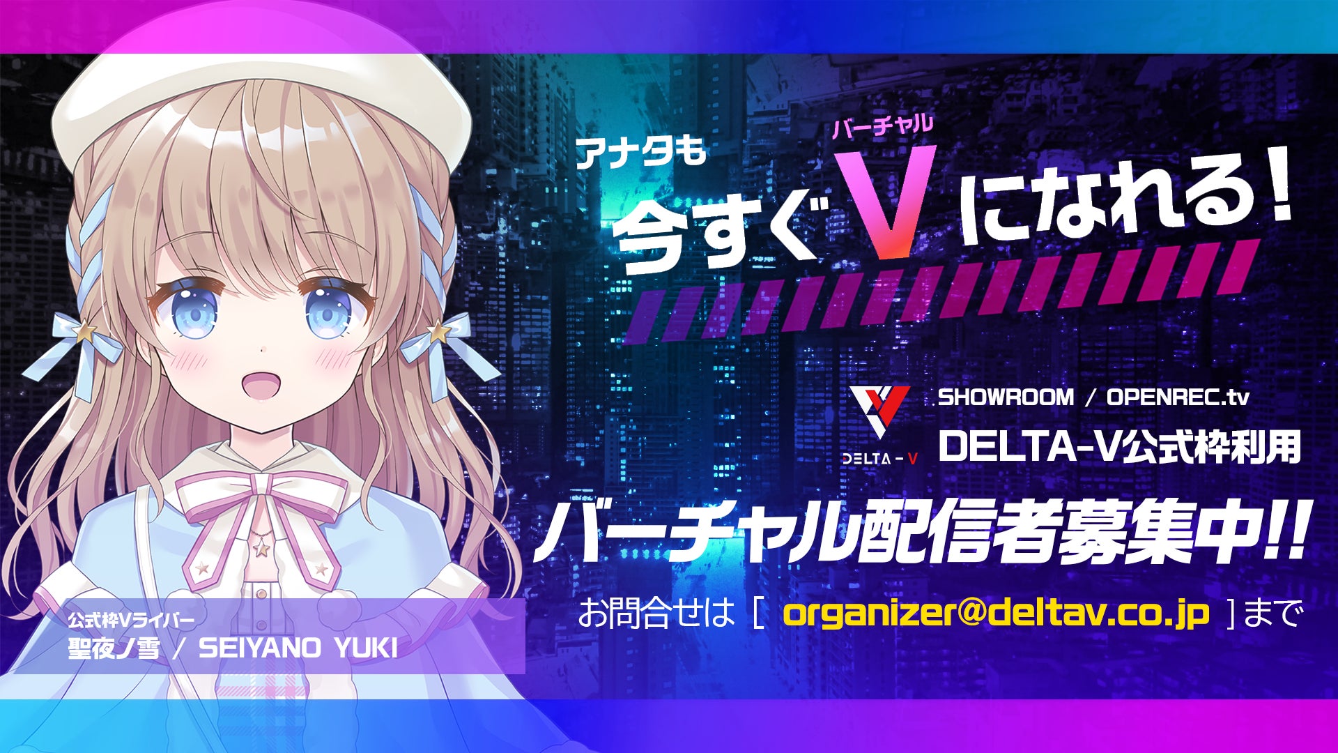 株式会社DELTA-VではSHOWROOM / OPENREC.tv…等のLIVE配信プラットフォームにてDELTA-V公式枠をご利用されるバーチャル配信者を募集しております。「個人Vの公式枠利用」という形で個人活動という立場を維持しながら利用できますのでお気軽にお問い合わせください。