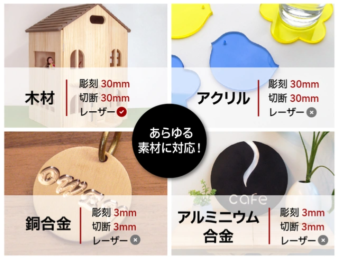 また、木材だけでなくレーザー刻印機で加工できなかった銅、真鍮、アルミニウム合金も最大3mmまで切断でき、スチールも切断可能です!