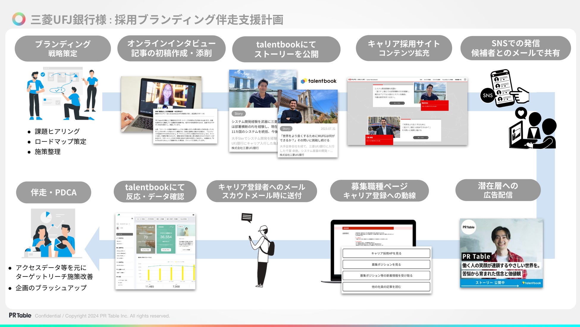 株式会社PR Table(所在地:東京都千代田区、共同代表取締役:大堀 航/大堀 海)は、「働く人」から企業の魅力を伝える採用ブランディング支援サービス「talentbook」を、株式会社三菱UFJ銀行(所在地:東京都千代田区、取締役頭取執行役員 半沢 淳一)に提供開始。キャリア採用向けに行員紹介のコンテンツの制作・活用をご支援し、採用数増加に寄与したことをお知らせします。