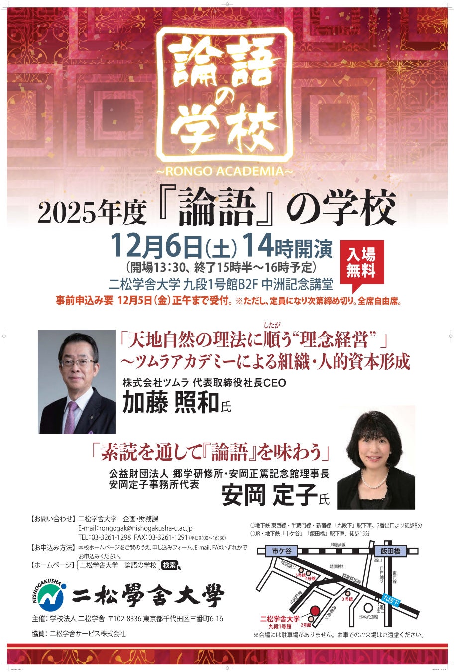 学校法人二松学舎(所在地:東京都千代田区、理事長:水戸 英則)は、12月6日(土)、「2025年度『論語』の学校-RONGO ACADEMIA-」を開催いたします。