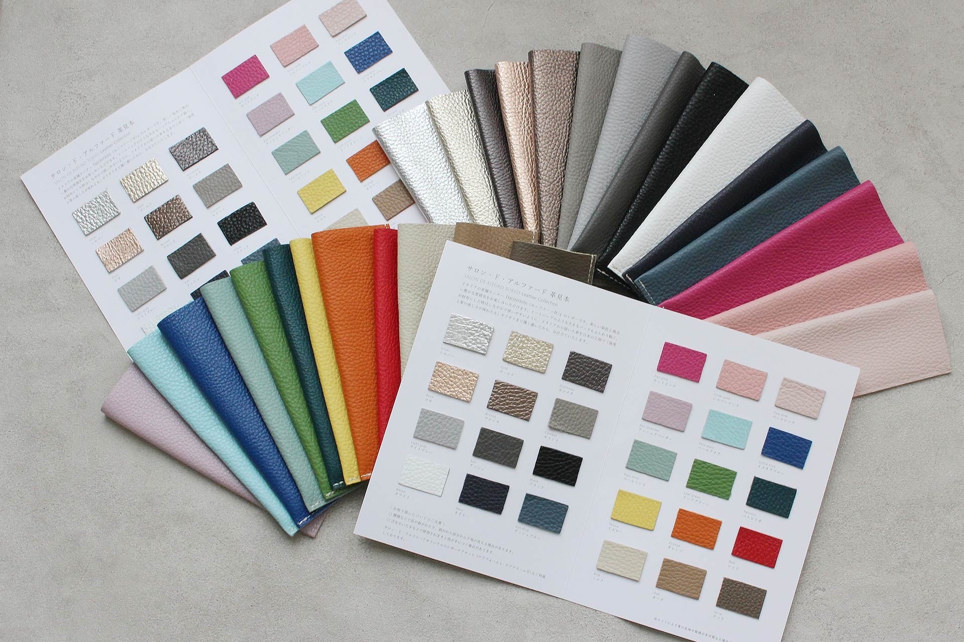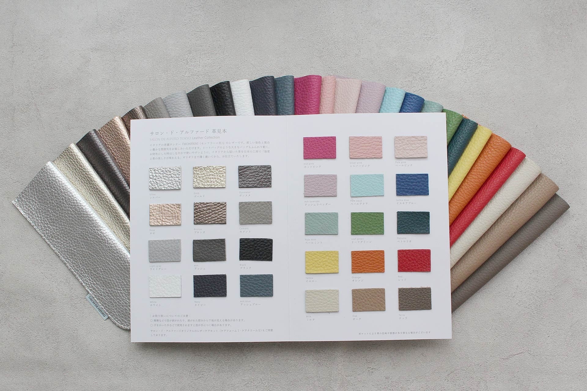 サロン・ド・アルファードで採用しているイタリアンシュリンク型押しレザーで仕立てたペンケースと、24色のレザーサンプル帳のセット。ペンケースは24色展開。