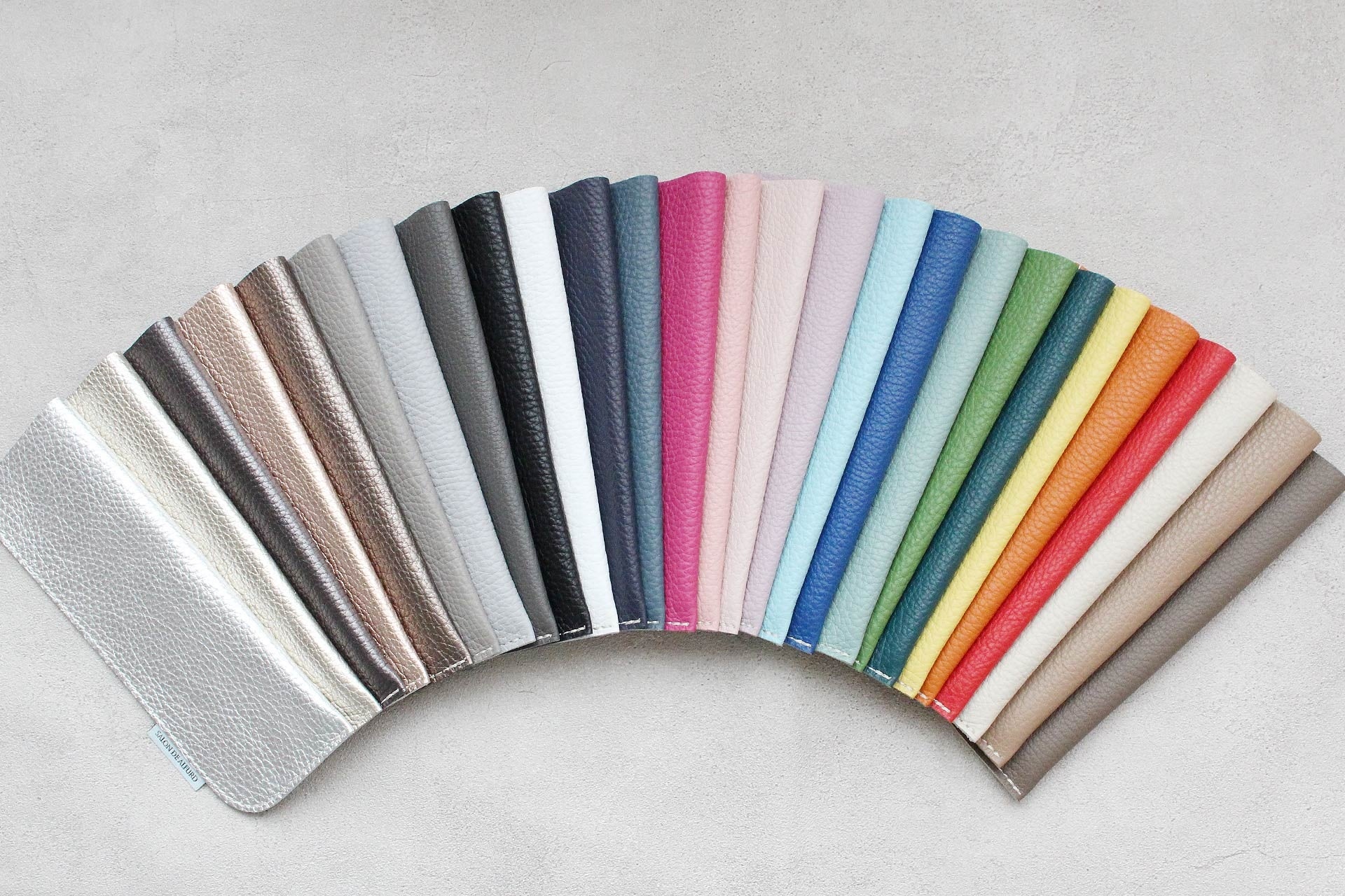 推しカラーに出会えそうな全24色を、縦2cm×横3cmのレザーサンプルにして1冊のサンプル帳にまとめました。さすがイタリアンレザーと思わせる美しい染色を実際に確認できます。こちらのサンプル帳は、レビュー特典としてプレゼントいたします。