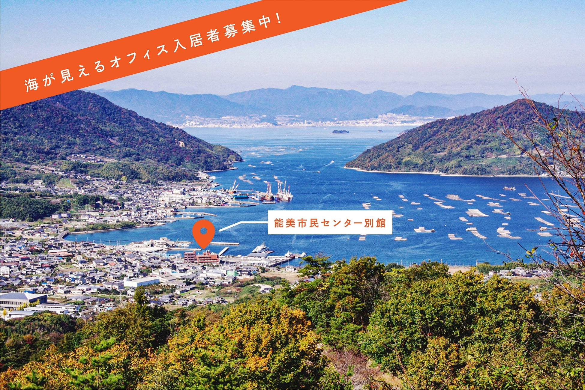 広島県江田島市では、周辺環境および景観に優れる本庁跡・能美市民センター別館4階の借受事業者を募集中。この施設は、広島市から高速艇で30分の中町港やコンビニから徒歩1分、複数の飲食店からもほど近い好立地でありながら景観にも優れ、穏やかな瀬戸内の海を目前に眺めることができます。