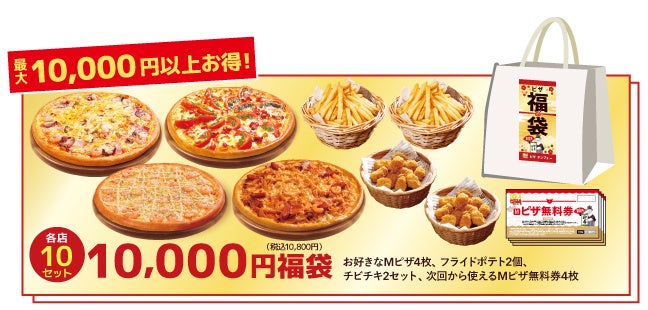商品内容/ お好きなMピザ4枚、フライドポテト2個、チビチキ2セット、次回から使えるM ピザ無料券4枚