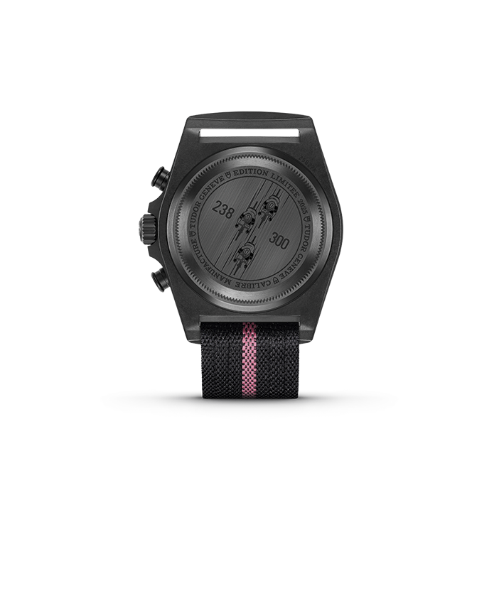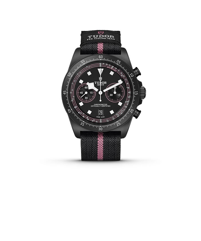 マットブラックのダイアルにピンクのアクセントを効かせたこのモデルは、視認性を最優先に設計されながらも、ジロ・デ・イタリアのカラーリングを彷彿とさせる。象徴的なスクエア型アワーマーカーと「スノーフレーク」針は、視認性を向上させるために発光面を最大化できるデザインとして、60年代にチューダーが考案。本作では、厳しい条件下でも最適な視認性を実現する発光性セラミック混合物で作られている。ダイアル外縁に45度の角度をつけて配したフランジには、タキメーターの目盛りが記されており、その内側の数字はライダーの走行速度に焦点を当てている。