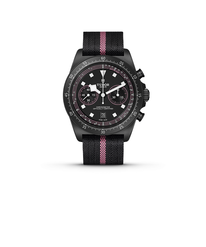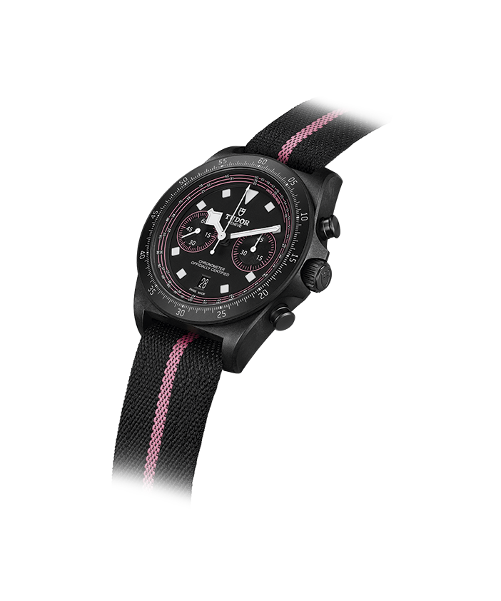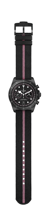 チューダーは2010年にいち早くファブリックストラップを採用して以来、常に先駆者であり続けている。フランスのサン・テティエンヌで150年以上家族経営を続けるジュリアン・フォール社によって、19世紀製の織機を用いて生み出されるファブリックストラップ。それは品質と快適さを両立する唯一無二の存在である。ペラゴス FXDのためにジュリアン・フォールとチューダーは、新しい構造のストラップを開発した。幅22 mmのピンクのストライプが入ったブラックのジャカード織テクニカルファブリックに伝統的なバックル。バイクライドには最適だ。