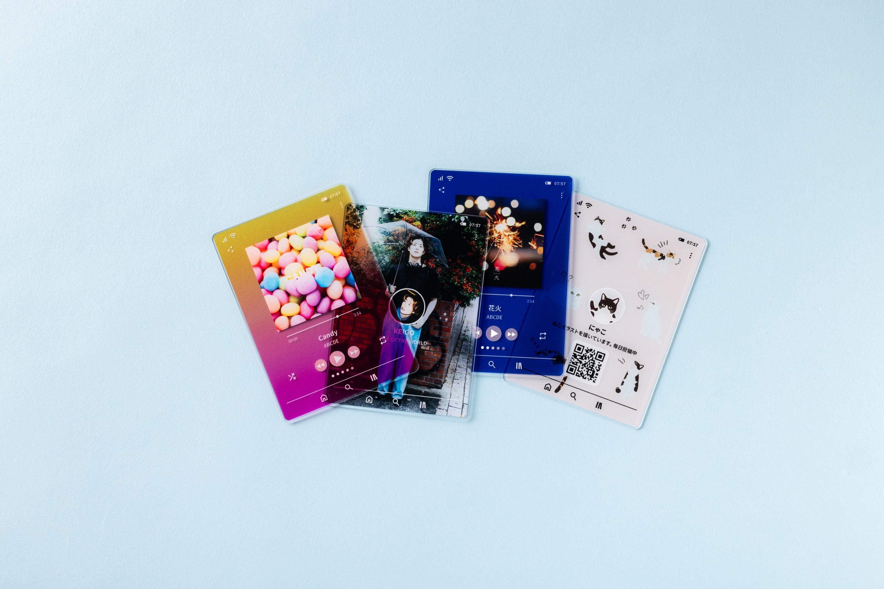 カードのモチーフテーマを“ミュージック”、“プロフィール”から選択し、任意の画像と文字を入れて作るオリジナルのアクリルトレカ。透け感がありながらも、アクリルのしっかりとした作りで特別感がアップ。