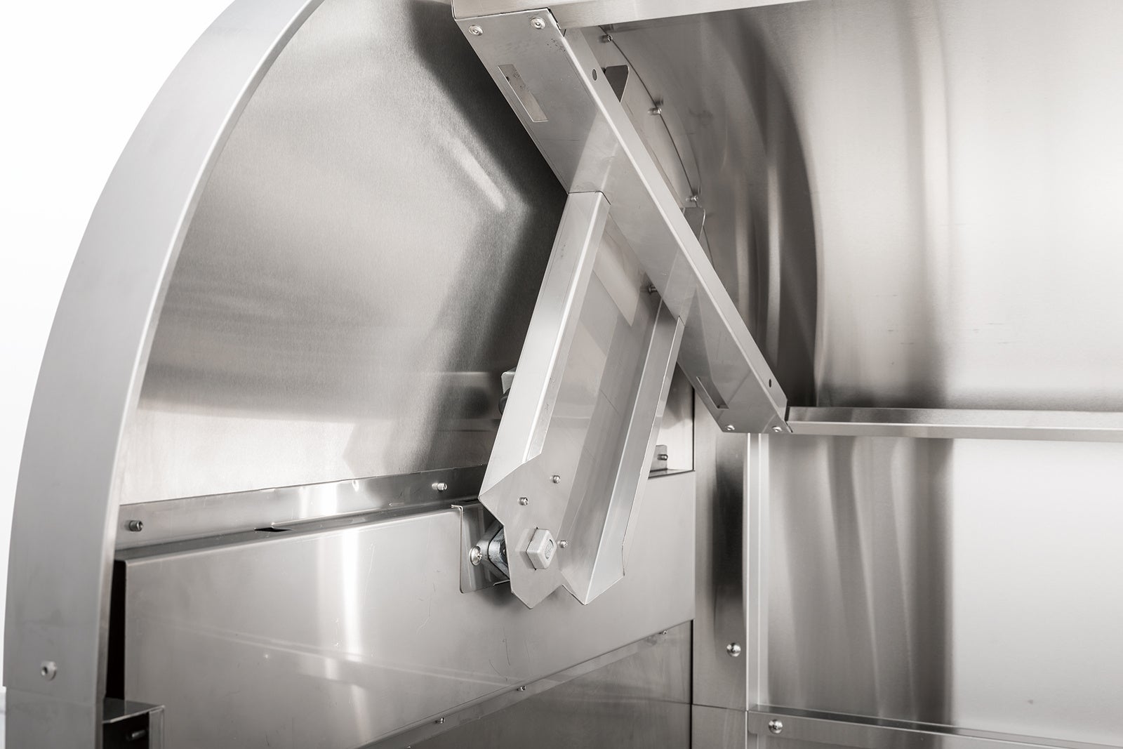 上部の扉は「回転式」なので、本体内部に扉が納まり、上部分に扉開閉のためのスペースを必要としません。前扉は前面にスペースがなくても開閉するオリジナル機構の「上下スライド式扉」です。限られた空間にも設置できる、省スペース設計です。
