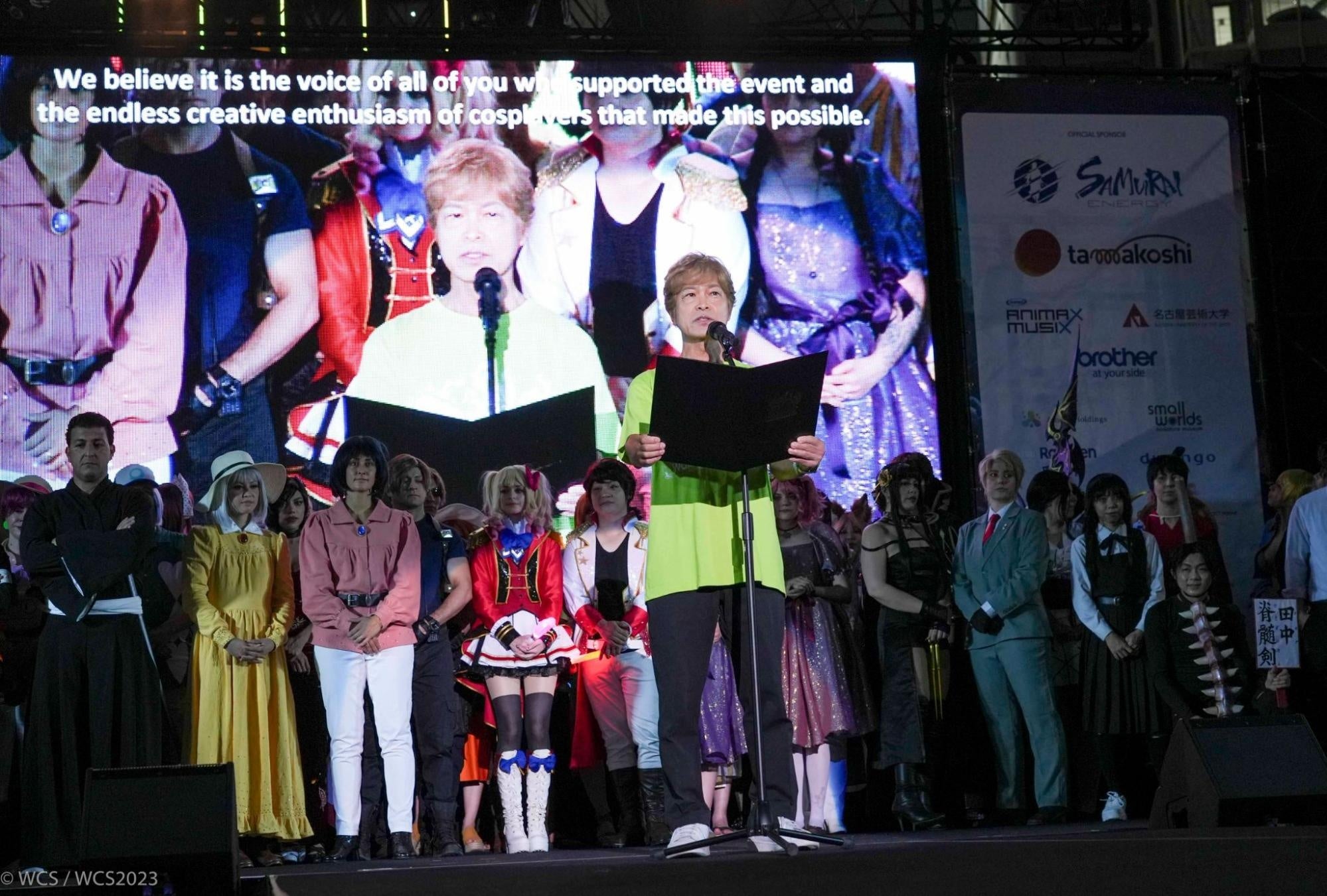 ワールドコスプレチャンピオンシップ審査委員長である古谷徹が登場した。主催者に代わりイベントを締めくくる閉会の挨拶を行った。