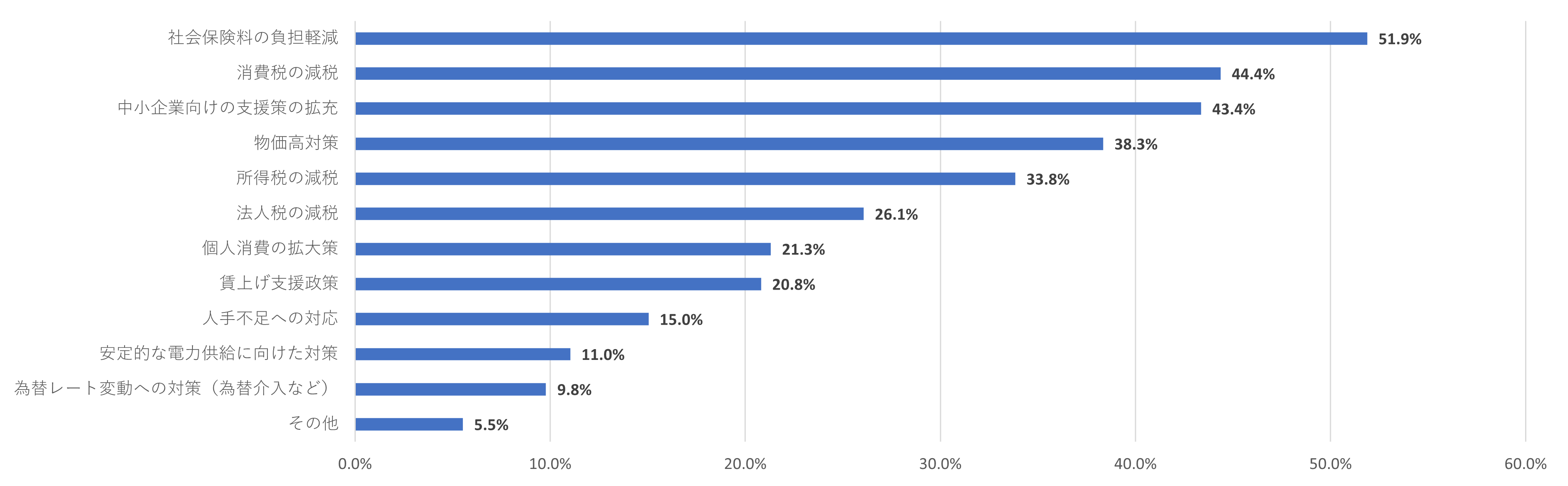 今後政府に求める経済支援策は何か聞いたところ、最多が「社会保険料の負担軽減」で51.9%、次いで「消費税の減税」が44.4%、「中小企業向けの支援策の拡充」が43.4%、「物価高対策」が38.3%と続いた。また、5.5%を占めたその他の回答では、インボイス制度の見直し・廃止を求める内容の回答が複数見られた。