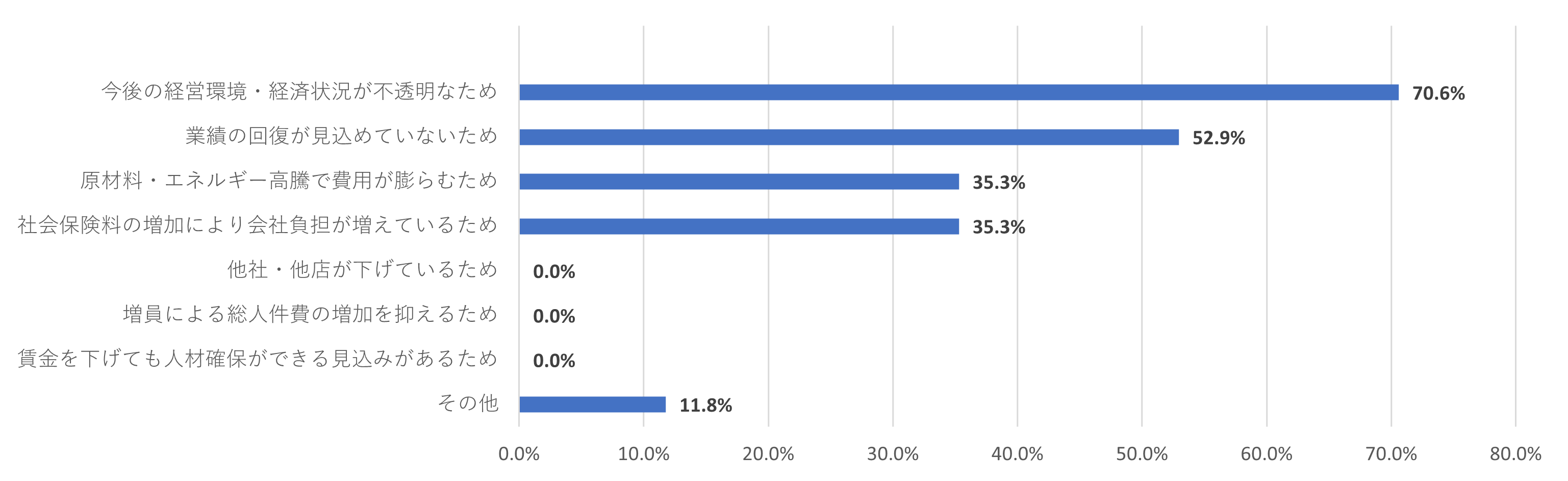 一方の「引き下げ予定(引き下げ済み)」と答えた方の理由では、最多の「今後の経営環境・経済状況が不透明なため」が上期から37.3ポイント上昇して70.6%、次いで「業績の回復が見込めていないため」が52.9%、それに次ぐ「原材料・エネルギー高騰で費用が膨らむため」「社会保険料の増加により会社負担が増えているため」がどちらも上期と比較してどちらも8.6ポイント増加し35.3%であった。