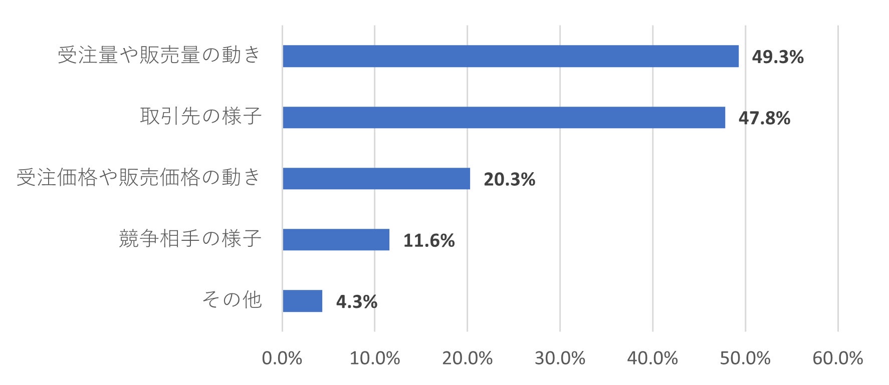 身の回りの景気が「良くなっている」「やや良くなっている」と答えた人にその理由を聞いたところ、「受注量や販売量の動き」が49.3%、「取引先の様子」が47.8%、「受注価格や販売価格の動き」が20.3%、「競争相手の様子」が11.6%、その他が4.3%という結果だった。