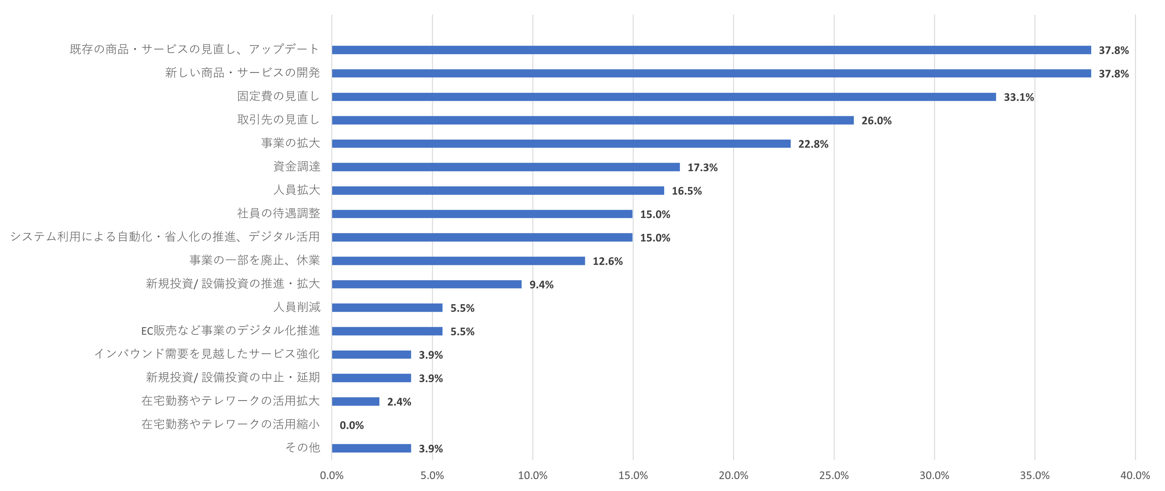 上記で「行った」と回答した方にどのような見直し施策を行ったか聞いたところ、最多が「既存の商品・サービスの見直し、アップデート」「新しい商品・サービスの開発」で同率37.8%、「固定費の見直し」が33.1%、「取引先の見直し」が26.0%と続く結果だった。
