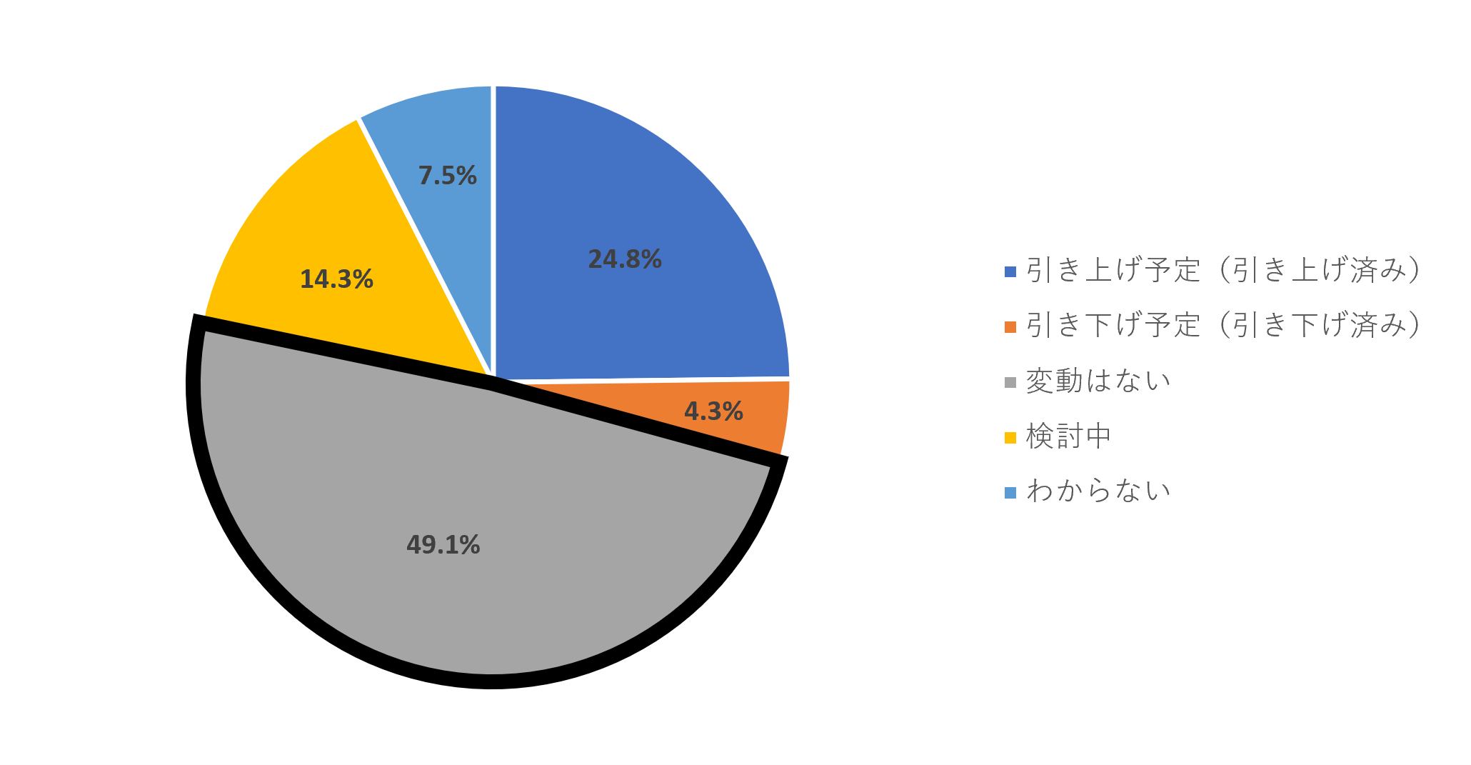 来年度、賃金の引上げもしくは引き下げの実施予定はあるかについて聞いたところ、「変動はない」が約半数を占めて49.1%、「引き上げ予定(引き上げ済み)」が24.8%、「検討中」が14.3%、「引き下げ予定(引き下げ済み)」が4.3%、「わからない」が7.5%という結果だった。