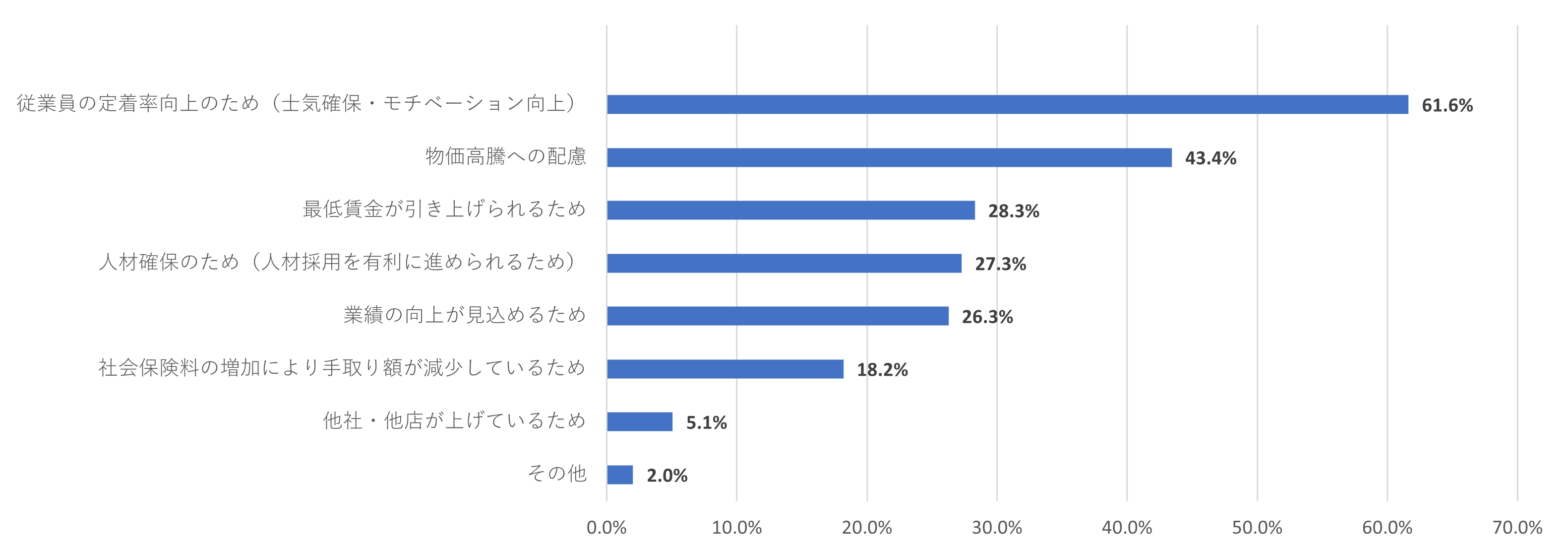 「引き上げ予定(引き上げ済み)」と答えた方の理由では、最多が「従業員の定着率向上のため(士気確保・モチベーション向上)」で61.6%、次いで「物価高騰への配慮」が43.4%、それに次ぐ「最低賃金が引き上げられるため」が上期に比べて15.9ポイント上昇した28.3%だった。