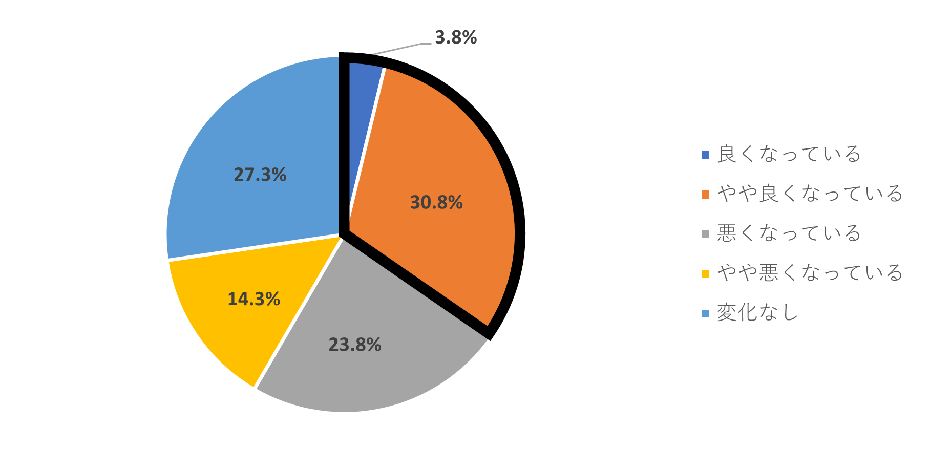 身の回りの景気は良くなっていると感じるかについて聞いたところ、「良くなっている」「やや良くなっている」と回答した人が34.6%、「悪くなっている」「やや悪くなっている」と回答した人が38.1%、「変化なし」は27.3%という結果だった。