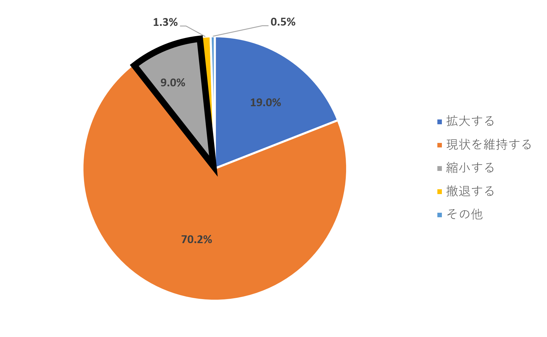 2024年度上期の事業展開の方向性についてどのように考えているか聞いたところ、「現状を維持する」が最多で70.2%、「拡大する」が19.0%、「縮小する」が9.0%、「撤退する」が1.3%、その他が0.5%という結果だった。
