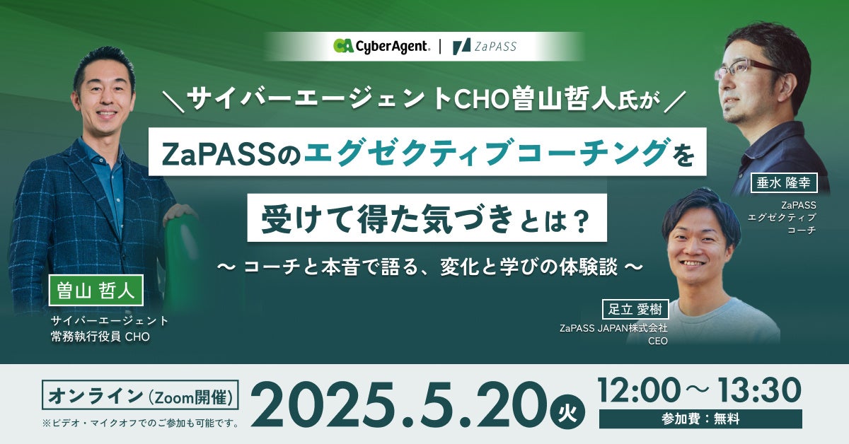 ZaPASS JAPAN株式会社(本社:東京都千代田区、代表取締役CEO:足立愛樹、以下「ZaPASS」)は、2025年5月20日(火)に、サイバーエージェント 常務執行役員CHO 曽山哲人氏と、同氏のエグゼクティブコーチを担当した垂水隆幸氏を迎えたオンラインイベントを開催いたします。