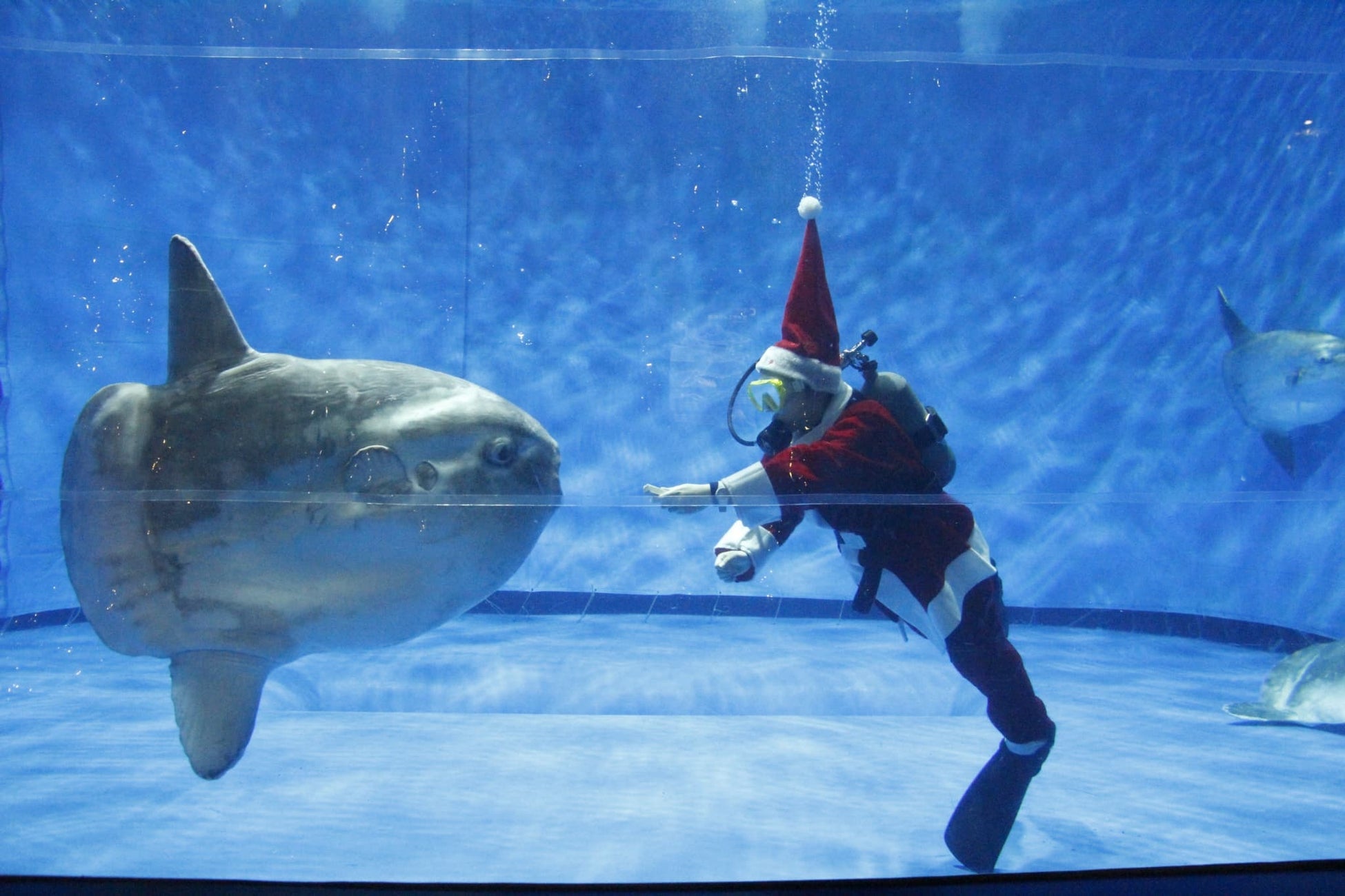 出会いの海の大水槽とマンボウ水槽にサンタクロースダイバーがやってくる