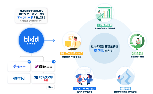 『bixid(ビサイド)』は、会計ソフトデータをアップロードし、弊社の特許技術により、中小企業の経理・経営管理業務を標準化することを目的として開発されたサービスです。