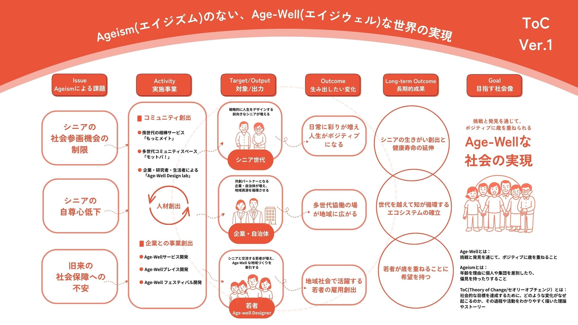 この度AgeWellJapanでは、事業成長の結果どのような世界をつくるのかという道筋や理論を一枚絵で可視化したToC*⁴(セオリーオブチェンジ)を作成しました。