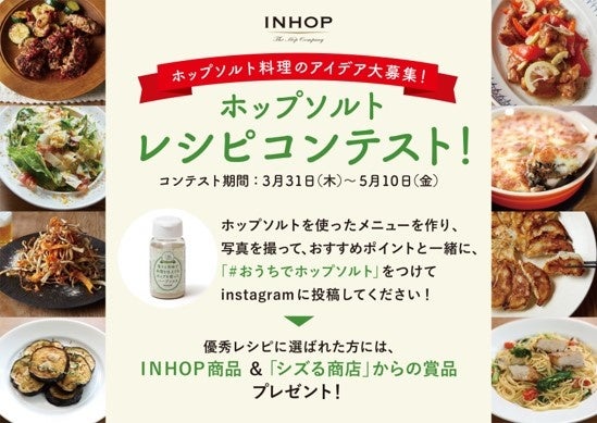 ホップソルトを使ったメニューを作り、写真を撮って、おすすめポイントといっしょに、「#おうちでホップソルト」をつけてinstagramに投稿していただきます。その料理を審査し、優秀レシピに選ばれた方には、 INHOP商品および鳥羽シェフの「シズる商店」からの賞品をプレゼントいたします。