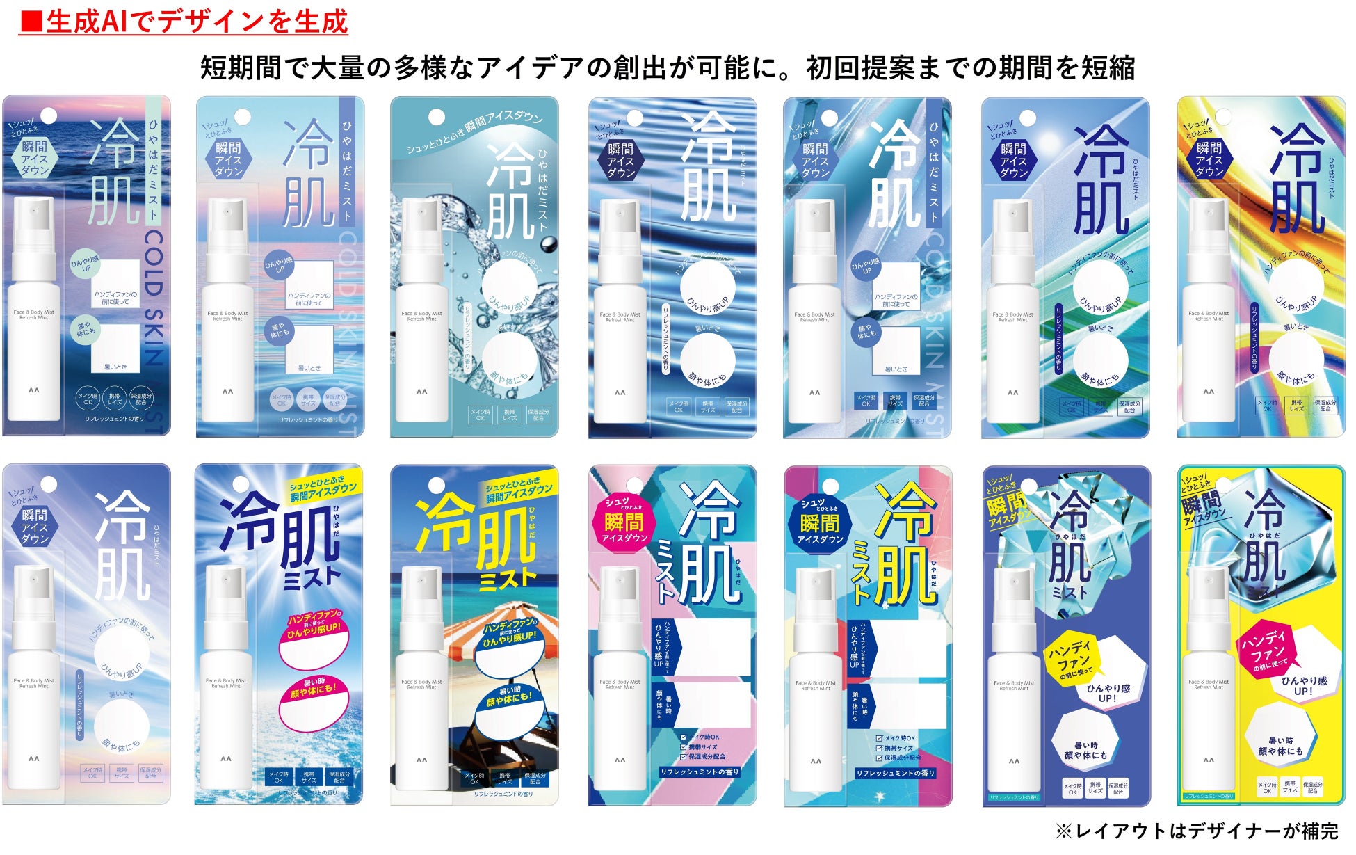 『マンダム 冷肌ミスト リフレッシュミント』では、デザイン開発の初期段階で本AIを活用しました。本AIで生成された画像を参考に、イラストやデザインをデザイナーが作成し直し、商品デザインを完成させています。従来2~3週間かかる初回提案までを1週間に短縮し、通常の倍以上のデザインを提案しました。本AIを活用することで、短期間で大量の多様なアイデアの創出が可能になります。デザイン開発の初期から具体的なアイデアを確認できるので、デザインの方向性の共有化が短時間で行え、デザイン開発の期間を大幅に削減することができます。その結果、通常3か月程度かかるデザイン開発期間を1か月半に短縮しました。また、これまでは時間の制約から提案できなかった色や素材の組み合わせを作ることができ、発想のジャンプが可能になります。本AIで、マーケターやデザイナーの創造性を広げ、より高度化された効果的なデザイン開発を実現します。