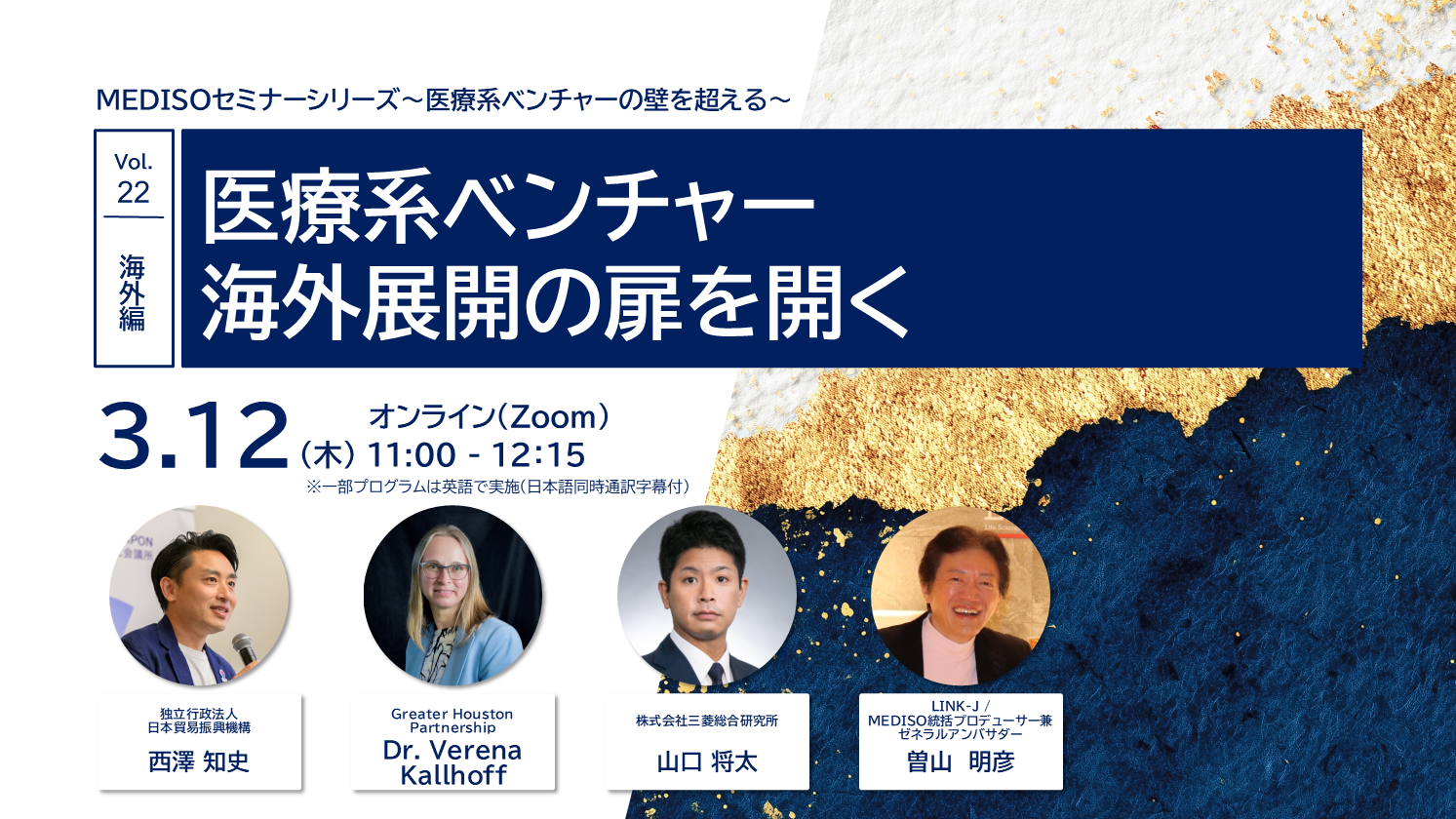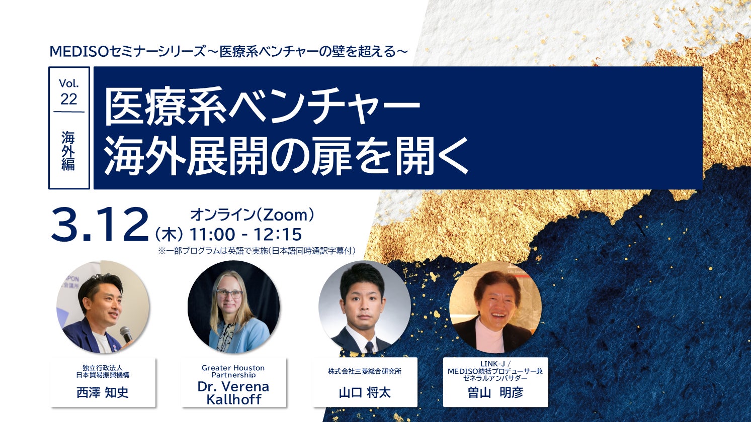 さらに、MEDISO事務局、MEDISO統括プロデューサー兼ゼネラルアンバサダー/LINK-J 曽山も交えて、海外展開に向けた公的プログラムの活用や現地ネットワークの構築の仕方等についてパネルディスカッションします。海外展開にこれから取り組む、既に取り組んでいるが手探りで進めている、ベンチャー企業やアカデミアの皆様は必見のセミナーです!