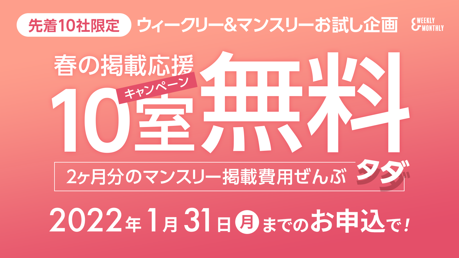 【先着10社限定】2月・3月の2ヶ月間、マンスリーマンション10室無料掲載キャンペーン!物件登録は最初の1部屋無料サポート付き/Weekly&Monthly株式会社