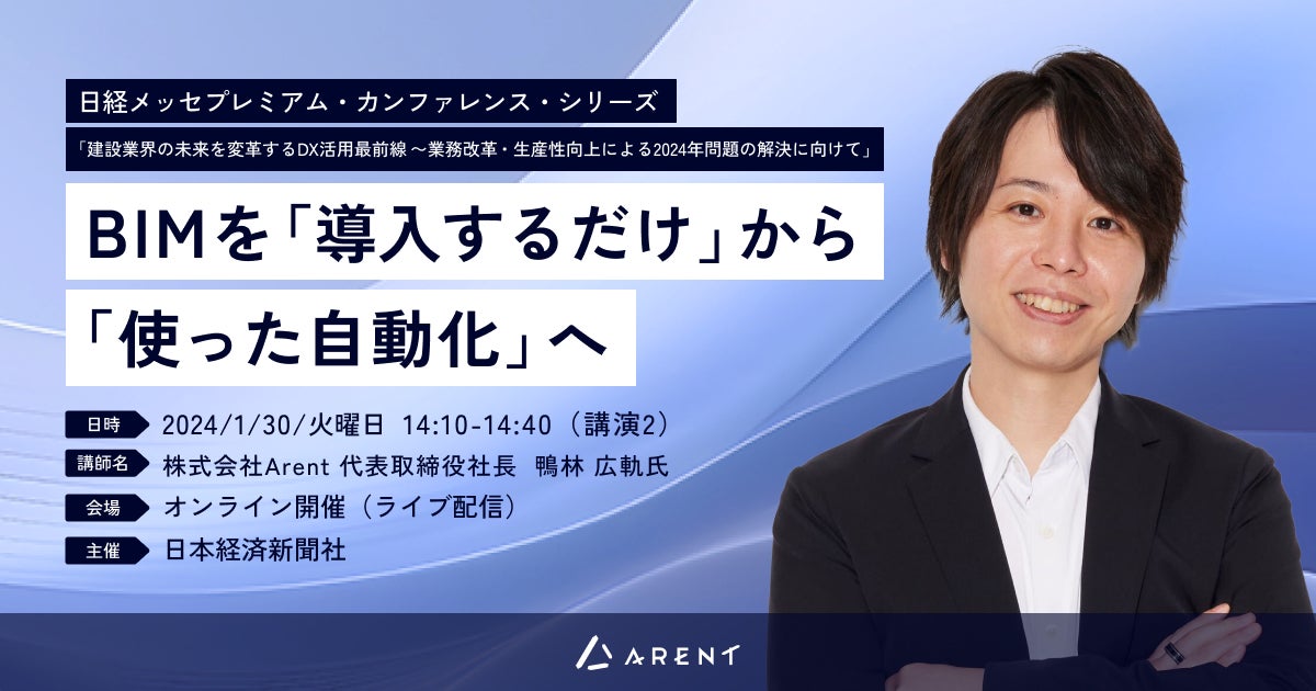 1月30日(火)開催|日経メッセプレミアム・カンファレンス・シリーズ 「建設業界の未来を変革するDX活用最前線〜業務改革・生産性向上による2024年問題の解決に向けて」の協賛企業講演にArentが登壇