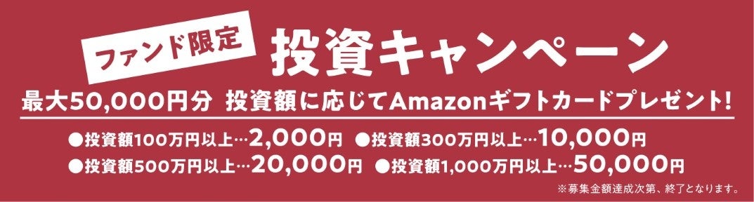 本ファンド投資額に応じて、最大50,000円分のAmazonギフト券をプレゼントいたします。詳しくは公式サイトをご覧ください。