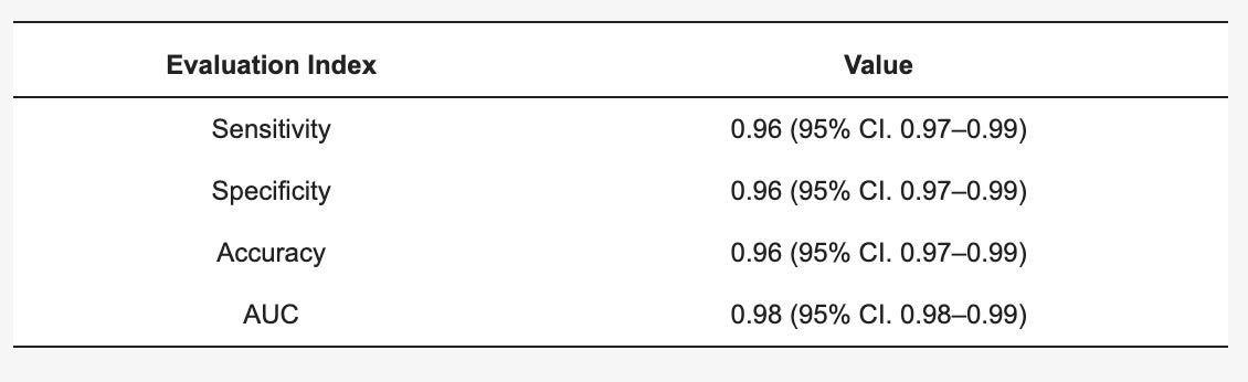 結果として、感度: 0.96 (95%信頼区間: 0.97 – 0.99)・特異度: 0.96(95%信頼区間: 0.97 – 0.99)・精度: 0.96(95%信頼区間: 0.97 – 0.99)・AUC: 0.98(95%信頼区間: 0.98 – 0.99)と高い性能を得ることできました。