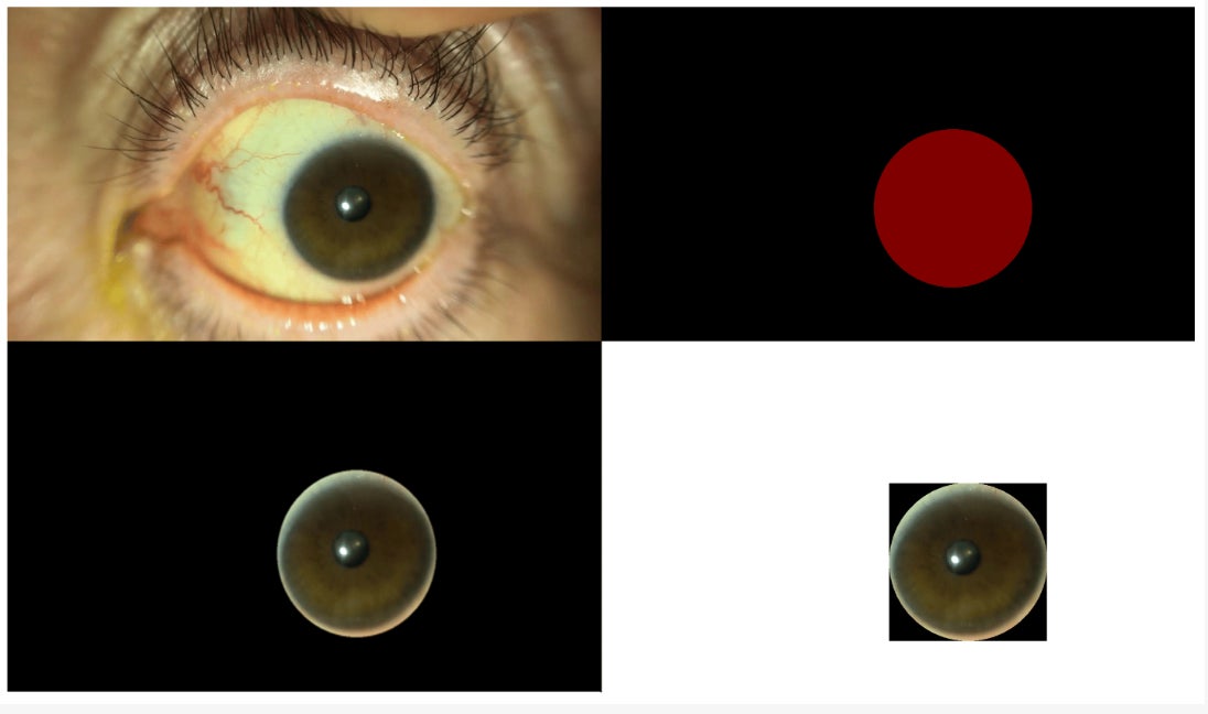 本研究は、SECを用いて収集された、合計5,996枚の画像に対し、眼科専門医が角膜混濁の有無をラベリング(アノテーション)、角膜混濁あり1,617枚・角膜混濁なし4,379枚に分類しました。画像の前処理として、セマンティック・セグメンテーションを用いた角膜領域の抽出(図1)や、CLAHEを用いた画像コントラスト調整(図2)を実施し、EfficientNet-B4というCNNモデルを用いた機械学習を実施しました。