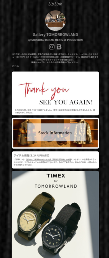 アプリのインストール不要で、LINEアプリ上で編集から公開までを行う事ができ、タレントやインフルエンサーだけでなく、アーティストやクリエイターなど、幅広い層に支持されています。lit.linkの利用は個人だけでなく、企業のホームページとして作成されることも多く、TOMORROWLANDでは、店舗ごとにlit.linkページを作成し、各店舗のSNSにURLを掲載しています。今回の8/17(水)〜8/30(火)に開催された伊勢丹新宿店での期間限定コンセプトストアでは、メッセージアプリを利用して顧客へ商品を勧める通常対応から流れを変え、期間限定コンセプトストア用に作成したlit.linkページにリアルタイムで人気アイテムや残数を書いていったところ、来店者数は前回開催時の3倍以上を記録。売上も増加し、目標値を上回る結果となりました。