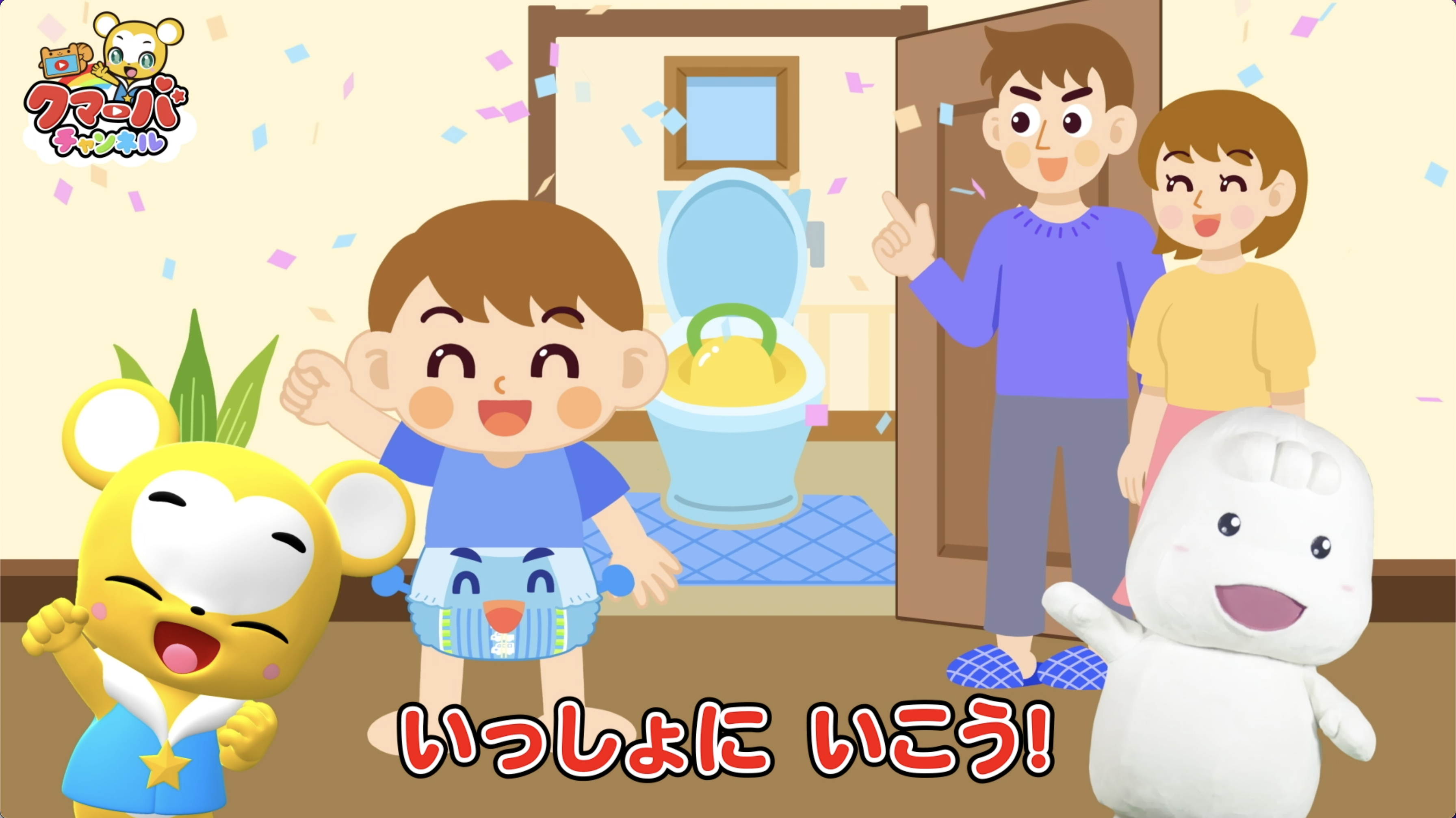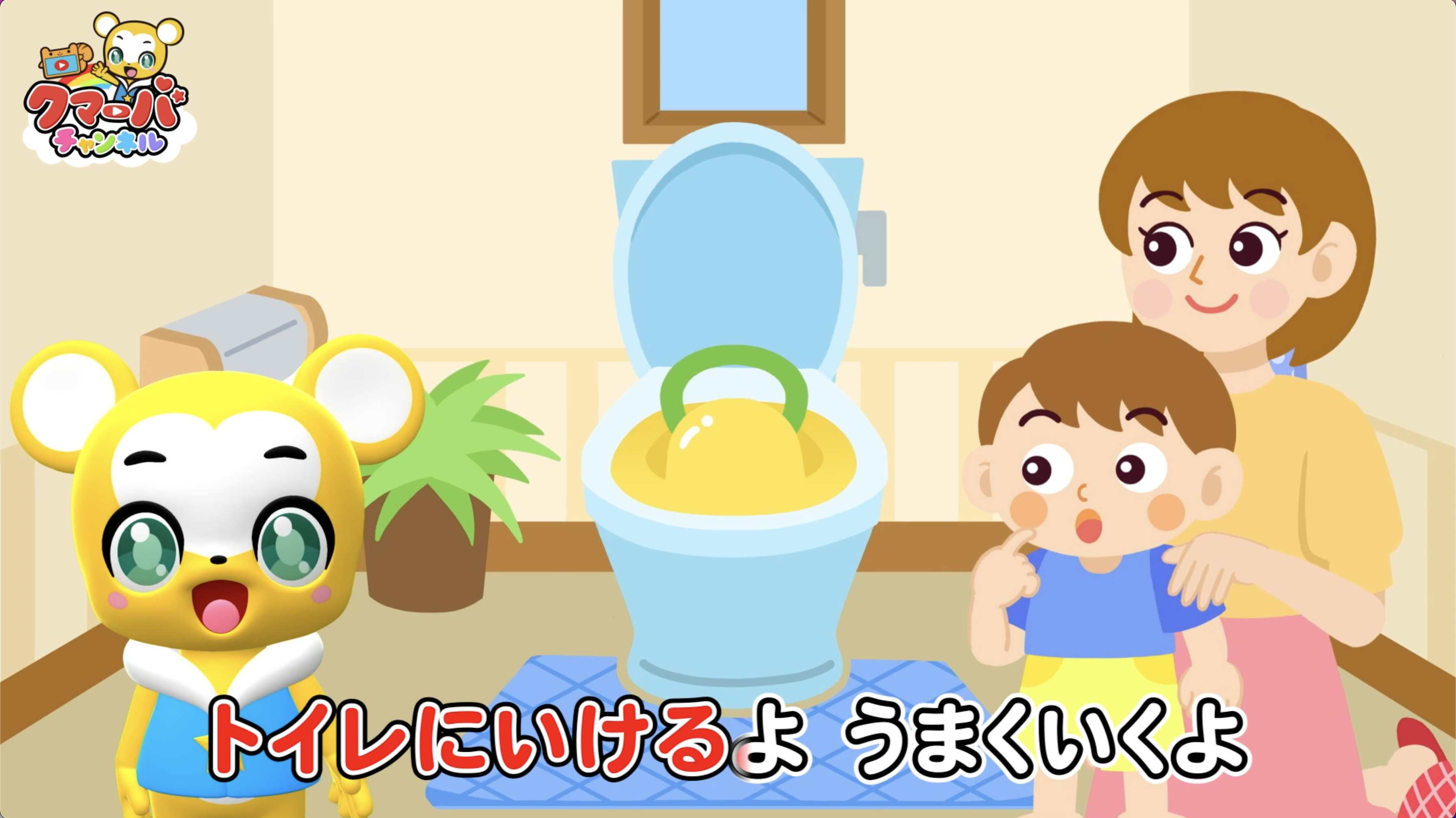 曲に合わせて、クマーバとムーニーちゃんが踊って、お子さまのトイレトレーニングを応援します!