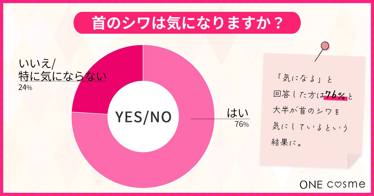 積極的に美容・コスメ情報を収集している美容好きのユーザーである20代~50代の男女100名に実施した「首のシワに関する調査」では、76%の方が首元のシワが気になると回答。首のシワが気になる理由を自由回答でお聞きすると「年齢を感じさせるから」という回答がほとんどでした。また、77%の方が首のシワ対策をしていることが明らかになりました。具体的な対策には「顔用の化粧水や美容液を首にも使っている」「マッサージをしている」などが挙げられました。