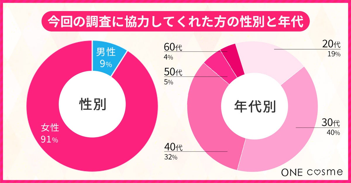 今回のアンケートに回答いただいた方は91%が女性でした。年代は30代が最も多く40%、次いで40代が32.0%でした。ONEcosmeの主要なユーザー層である30代〜50代の回答者は77%となりました。