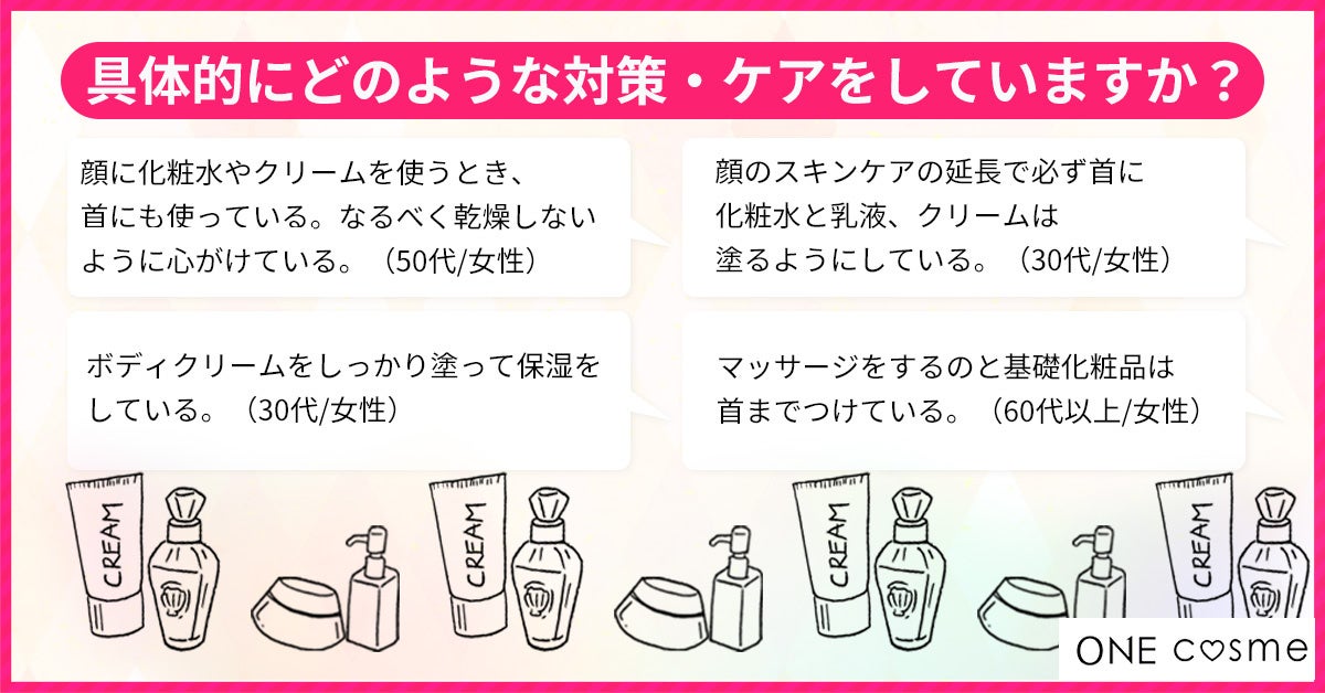 顔に化粧水やクリームを使うとき、首にも使っている。なるべく乾燥しないように心がけている。(50代/女性)