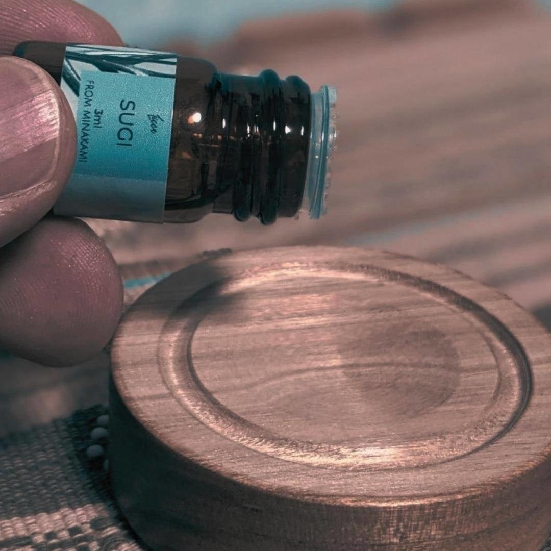 スギ、ヒノキ、アカマツ、モミ、アブラチャンなど木系の香りが中心。好きな場所で香りを楽しんでもらえるよう、木製オリジナルアロマディッシュもセットで販売しています。ウッドディッシュは日本のカスタネット発祥の地でもある群馬県みなかみ町らしく、職人がカスタネットの製造技術を応用して間伐材でひとつひとつ手作り。また、箱の中の緩衝材は化粧箱製造時期でる端切れを再利用しています。
