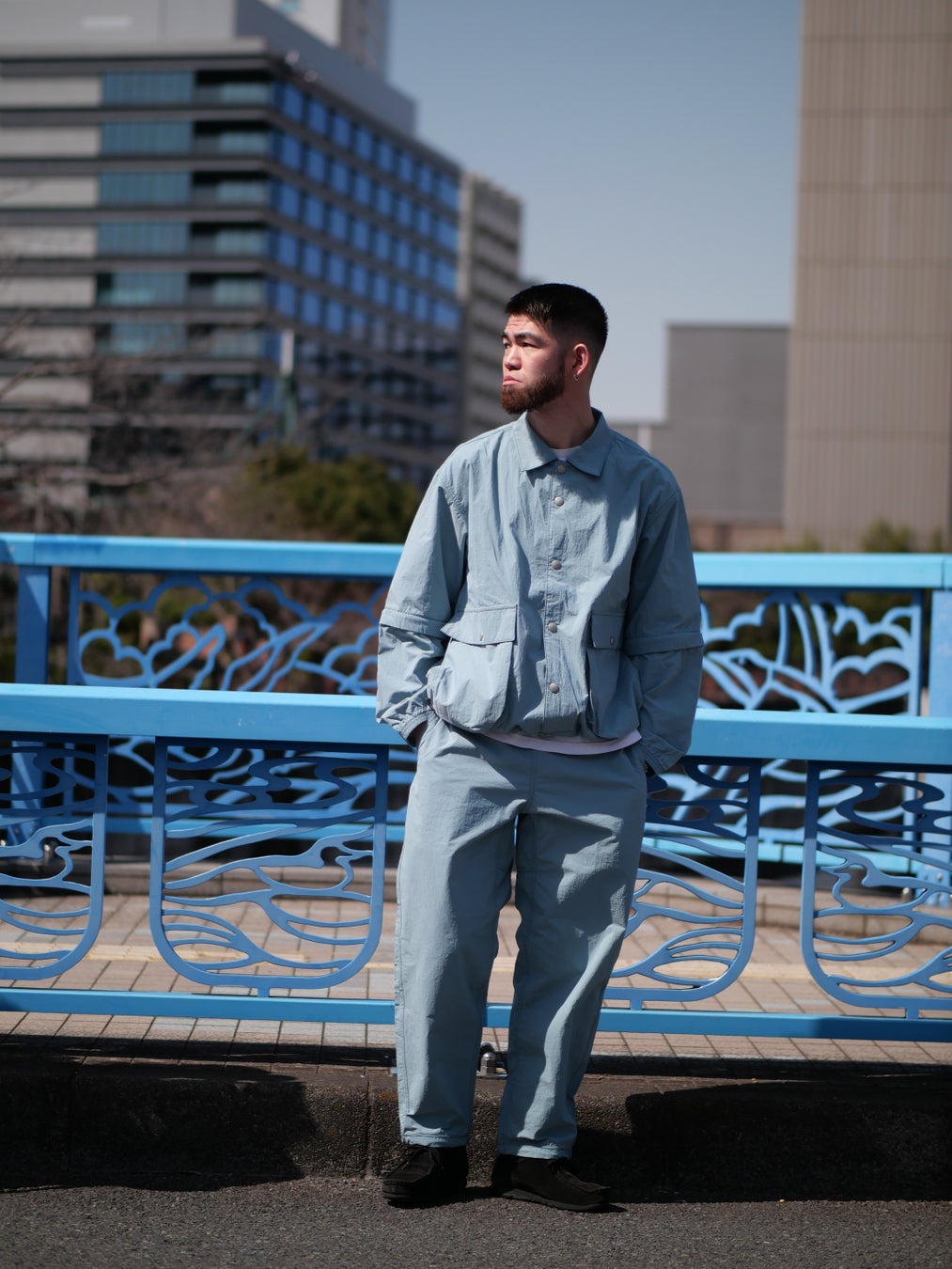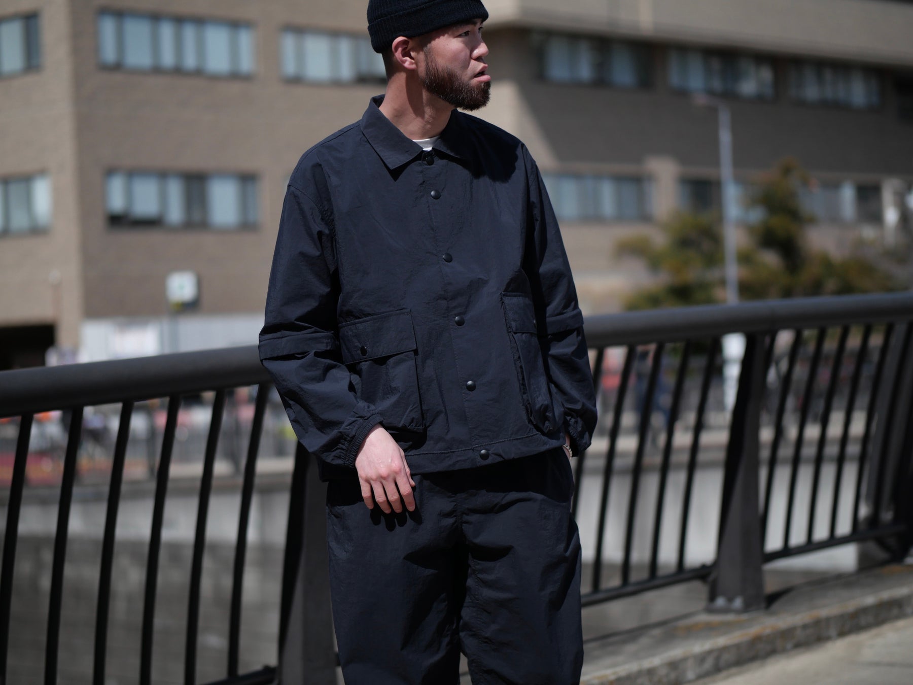 コーチジャケットをベースに別注し、フロントにマチ付きの立体ポケットを備え、袖には内蔵ZIPを施すことで半袖と長袖の切り替えが可能に。着丈はあえてショートタイプに設定し、軽やかな印象を演出。こだわり抜いたシルエットと機能性が融合した一着に仕上がっています。