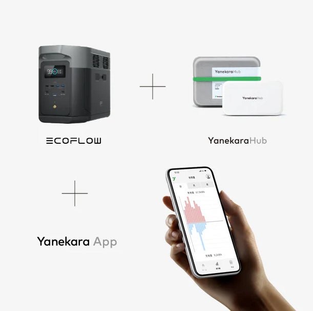 「Yanekara with EcoFlow」は、EcoFlowの大容量ポータブル電源「DELTA 2 Max」と、Yanekaraが開発した通信ゲートウェイ「Yanekara Hub」、そして充放電制御ソフトウェア「Yanekara One」を組み合わせ、太陽光発電の自己消費最大化やピークカットを実現するソリューションです。
