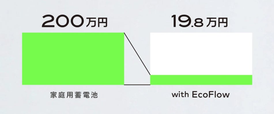 最小費用でスタート:一般的な定置型蓄電池の導入費用は約200万円対して、with EcoFlowなら約1/10の初期費用(19.8万円)でスタート可能です。「最小投資」で始め、必要に応じて後から自由に容量を拡張できます