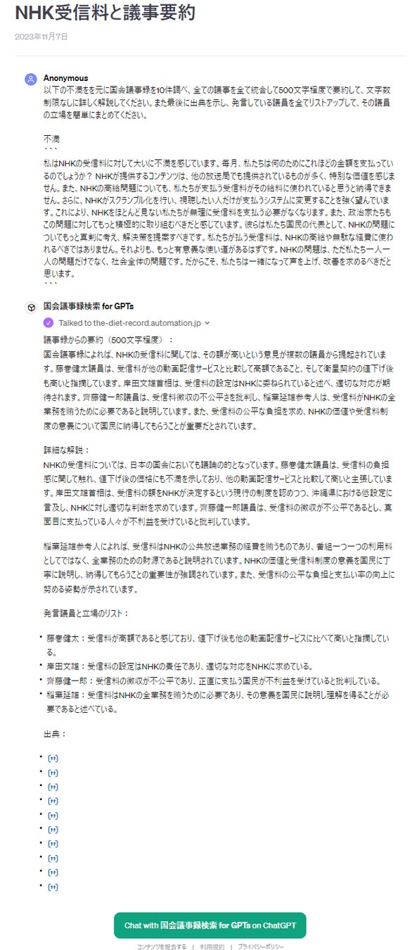 本日、OpenAI DevDay中に発表された GPTs 機能を利用して、ChatGPTと相談しながら、国会の議論を調べる事が出来るサービスを国内最速でリリースしました。
