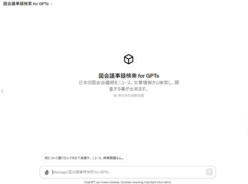 国会議事録検索 for GPTs は以下のリンクをクリックすると利用できます。