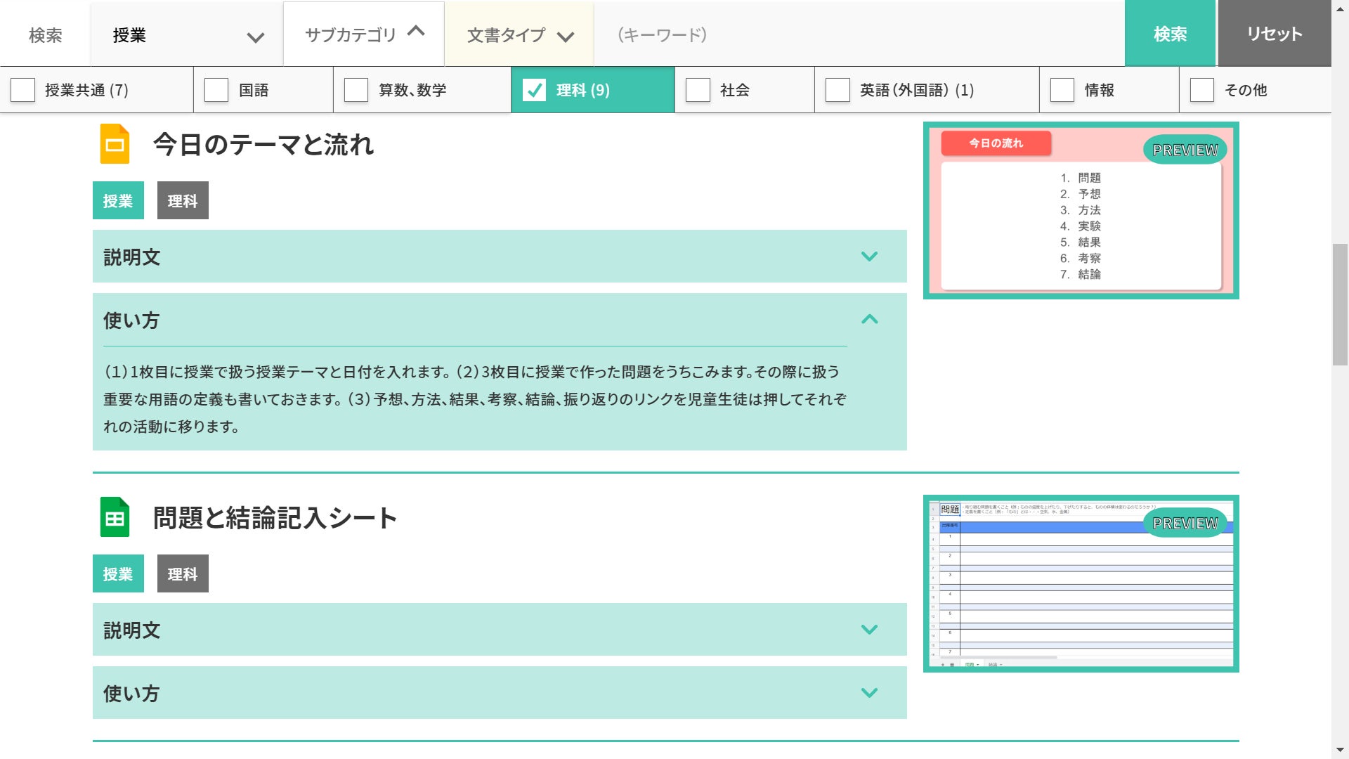 今回のバージョンアップでは、以前よりご要望の高かった教材の「プレビュー表示」やカテゴリや文書タイプでの「検索機能」が加わりました。各テンプレートの説明や使い方を簡単に確認することができるため、検索時間を短縮できます。