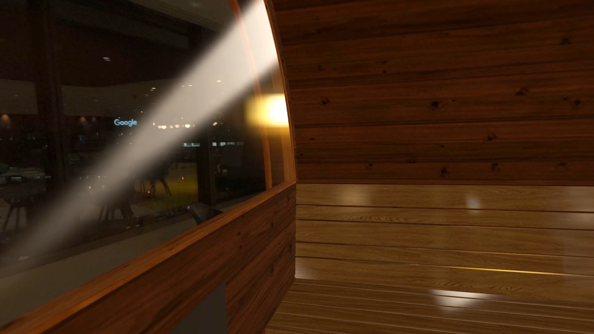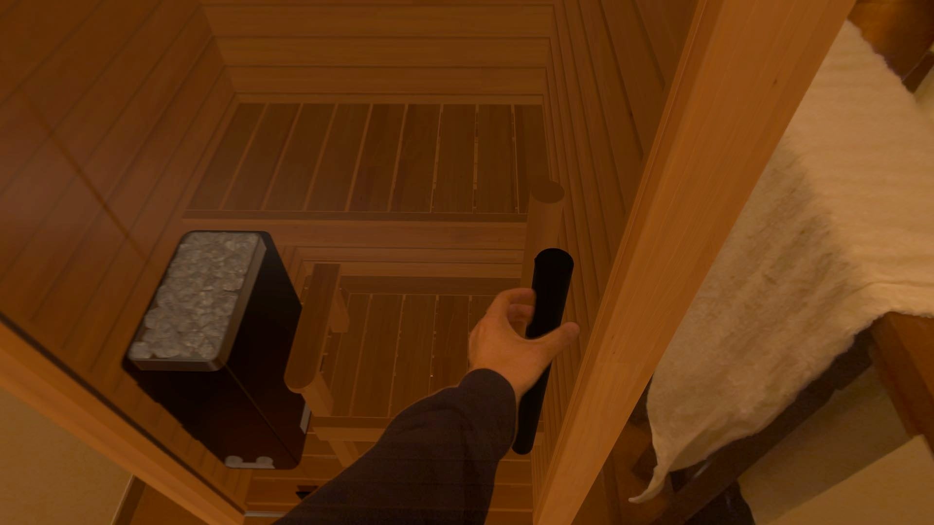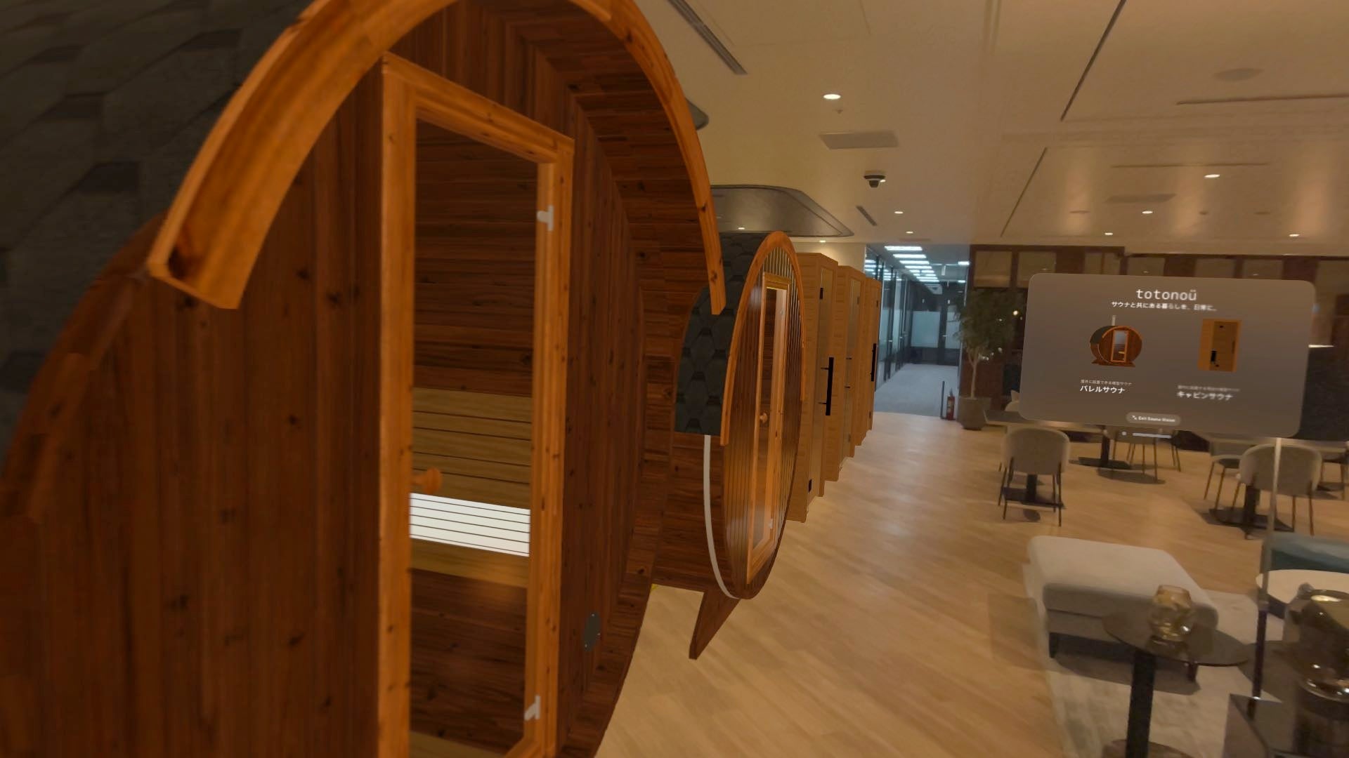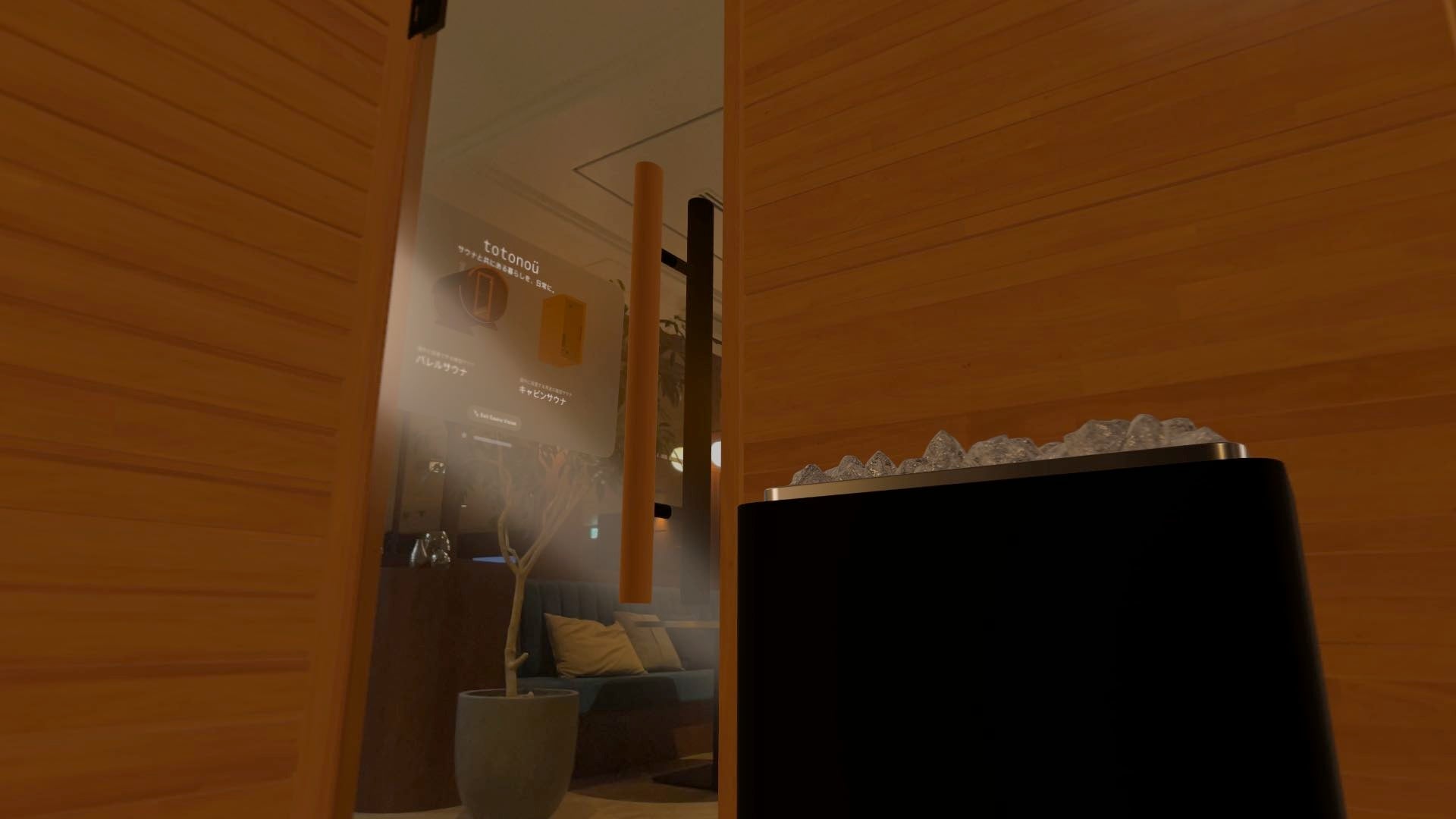 ボタンを押すと、実物大のサウナがバーチャル空間内で展開。実際に中に入って大きさや空間の感覚を体験することも。